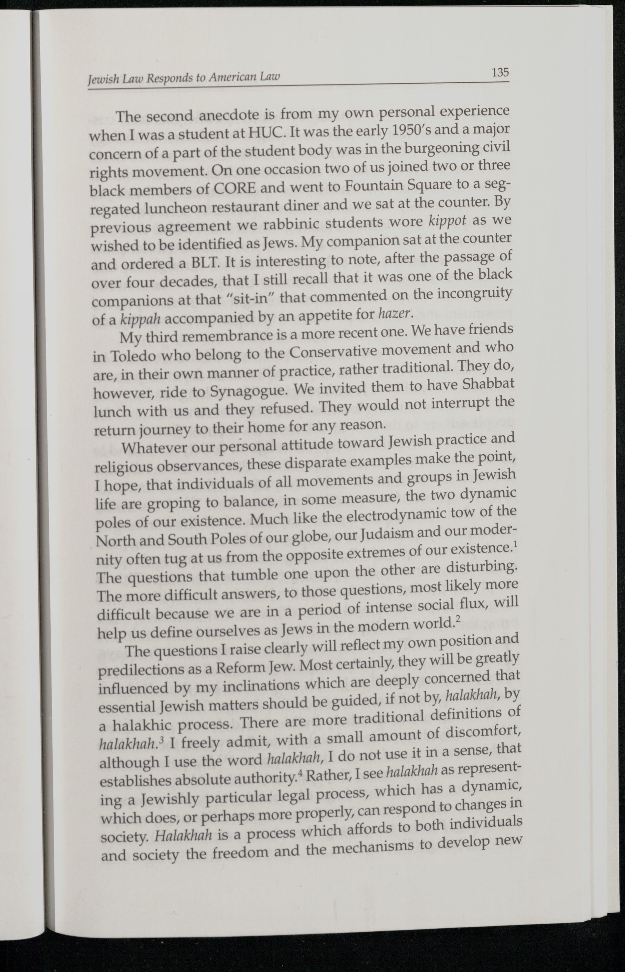 The second anecdote is from my own personal experience when I was a student at HUC. It was the early 1950's and a major concern of a part of the student body was in the burgeoning civil rights movement. On one occasion two of us joined two or three black members of CORE and went to Fountain Square to a segregated luncheon restaurant diner and we sat at the counter. By previous agreement we rabbinic students wore kippot as we wished to be identified as Jews . My companion sat at the counter and ordered a BLT. It is interesting to note, after the passage of over four decades, that I still recall that it was one of the black companions at that“sit-in” that commented on the incongruity of a kippah accompanied by an appetite for hazer.