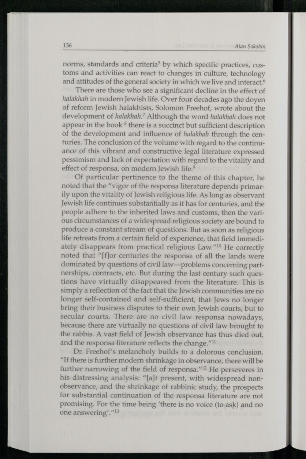 Of particular pertinence to the theme of this chapter, he noted that the“vigor of the responsa literature depends primarily upon the vitality of Jewish religious life. As long as observant Jewish life continues substantially as it has for centuries, and the people adhere to the inherited laws and customs, then the various circumstances of a widespread religious society are bound to produce a constant stream of questions. But as soon as religious life retreats from a certain field of experience, that field immediately disappears from practical religious Law.”'® He correctly noted that“[flor centuries the responsa of all the lands were dominated by questions of civil law—problems concerning partnerships, contracts, etc. But during the last century such questions have virtually disappeared from the literature. This is simply a reflection of the fact that the Jewish communities are no longer self-contained and self-sufficient, that Jews no longer bring their business disputes to their own Jewish courts, but to secular courts. There are no civil law responsa nowadays, because there are virtually no questions of civil law brought to the rabbis. A vast field of Jewish observance has thus died out, and the responsa literature reflects the change.”"