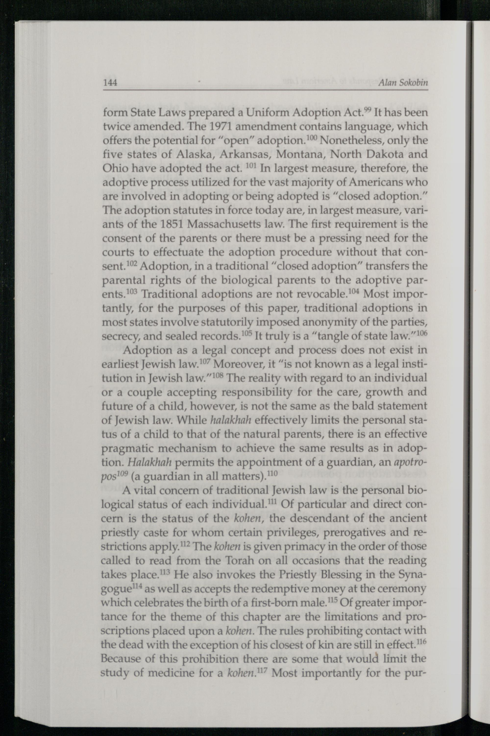 form State Laws prepared a Uniform Adoption Act.” It has been twice amended. The 1971 amendment contains language, which offers the potential for“open” adoption. Nonetheless, only the five states of Alaska , Arkansas , Montana , North Dakota and Ohio have adopted the act.'”! In largest measure, therefore, the adoptive process utilized for the vast majority of Americans who are involved in adopting or being adopted is“closed adoption.” The adoption statutes in force today are, in largest measure, variants of the 1851 Massachusetts law. The first requirement is the consent of the parents or there must be a pressing need for the courts to effectuate the adoption procedure without that consent.'”? Adoption, in a traditional“closed adoption” transfers the parental rights of the biological parents to the adoptive par
