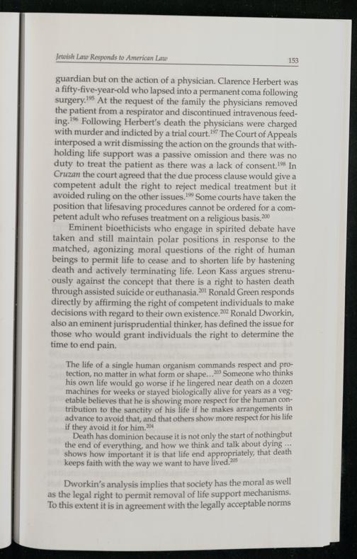 Eminent bioethicists who engage in spirited debate have taken and still maintain polar positions in response to the matched, agonizing moral questions of the right of human beings to permit life to cease and to shorten life by hastening death and actively terminating life. Leon Kass argues strenuously against the concept that there is a right to hasten death through assisted suicide or euthanasia.®! Ronald Green responds directly by affirming the right of competent individuals to make decisions with regard to their own existence.2”> Ronald Dworkin , also an eminent jurisprudential thinker , has defined the issue for those who would grant individuals the right to determine the time to end pain.