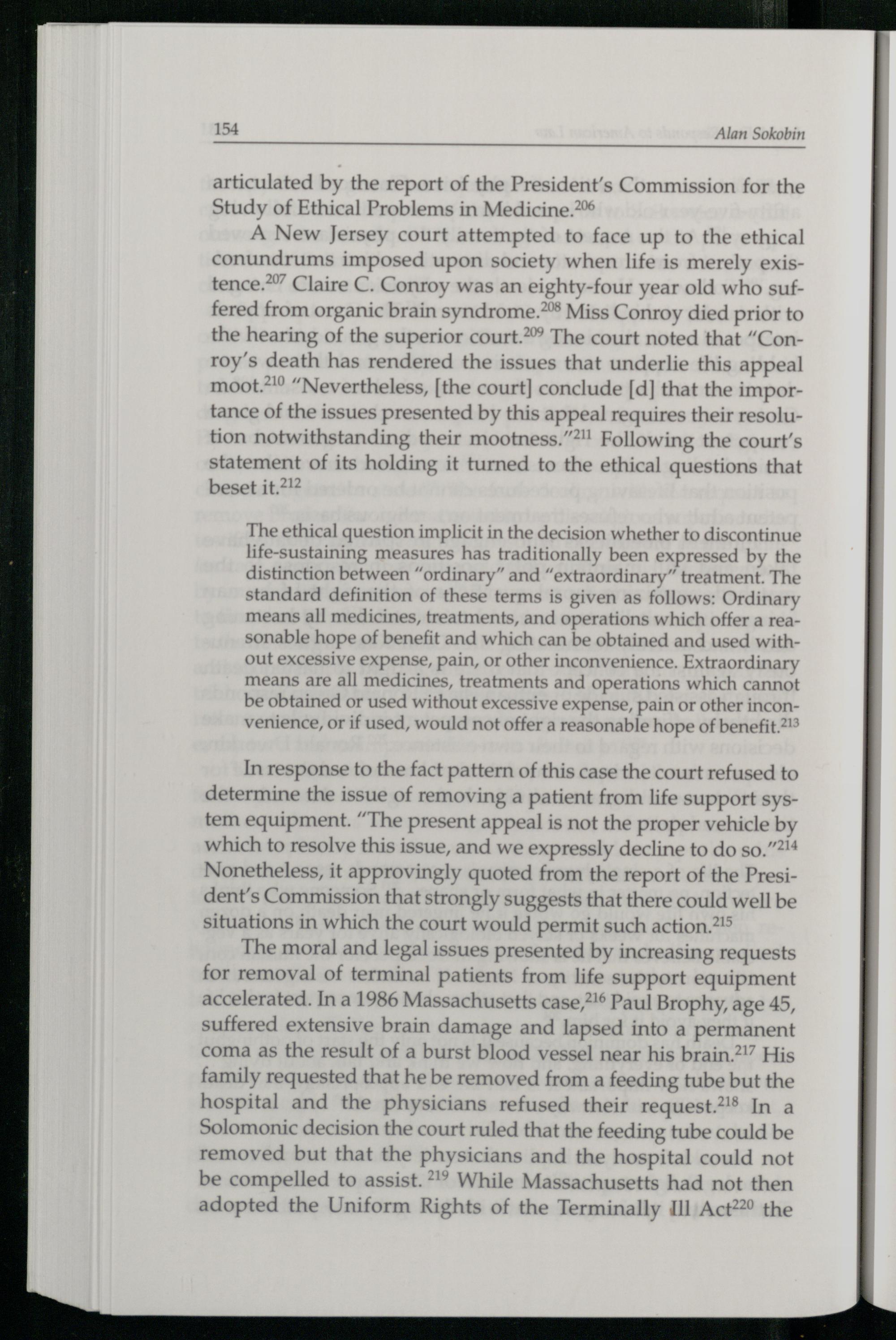 A New Jersey court attempted to face up to the ethical conundrums imposed upon society when life is merely existence.?”” Claire C. Conroy was an eighty-four year old who suffered from organic brain syndrome.?”® Miss Conroy died prior to the hearing of the superior court.” The court noted that“Conroy’s death has rendered the issues that underlie this appeal moot.”“Nevertheless,[the court] conclude[d] that the importance of the issues presented by this appeal requires their resolution notwithstanding their mootness.”?"! Following the court's statement of its holding it turned to the ethical questions that beset it.?!2
