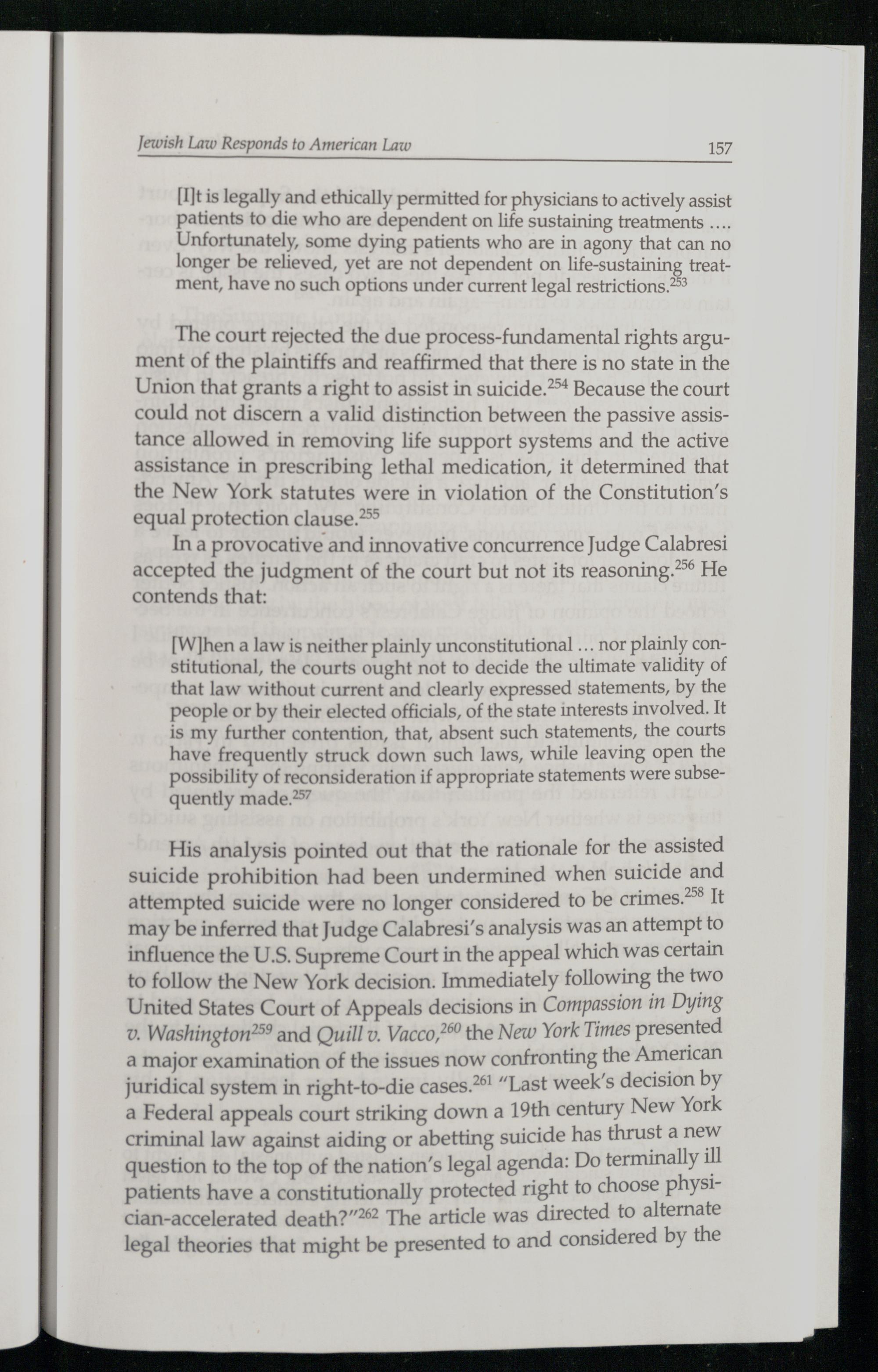His analysis pointed out that the rationale for the assisted suicide prohibition had been undermined when suicidetsnd attempted suicide were no longer considered to be crimes.” It may be inferred that Judge Calabresi ’s analysis wasan attempt to influence the U.S. Supreme Court in the appeal which was certain to follow the New York decision. Immediately following the two United States Court of Appeals decisions in Compassion in Dying v. Washington? and Quill v. Vacco,?®° the New York Times presented a major examination of the issues now confronting fhe American juridical system in right-to-die cases.?®!“Last week's decision by a Federal appeals court striking down a 19th century New Yor criminal law against aiding or abetting suicide has thrust ney question to the top of the nation’s legal agenda: Do sominaly i patients have a constitutionally protected right to choose physt cian-accelerated death?”%? The article was directed to alternate legal theories that might be presented to and considered by the