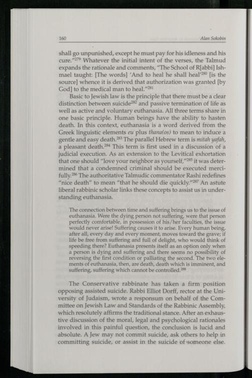 Basic to Jewish law is the principle that there must be a clear distinction between suicide?®? and passive termination of life as well as active and voluntary euthanasia. All three terms share in one basic principle. Human beings have the ability to hasten death. In this context, euthanasia is a word derived from the Greek linguistic elements eu plus thana(os) to mean to induce a gentle and easy death.” The parallel Hebrew term is mitah yafah, a pleasant death.” This term is first used in a discussion of a judicial execution. As an extension to the Levitical exhortation that one should“love your neighbor as yourself,”?® it was determined that a condemned criminal should be executed mercifully.” The authoritative Talmudic commentator Rashi redefines “nice death” to mean“that he should die quickly.”?” An astute liberal rabbinic scholar links these concepts to assist us in understanding euthanasia.