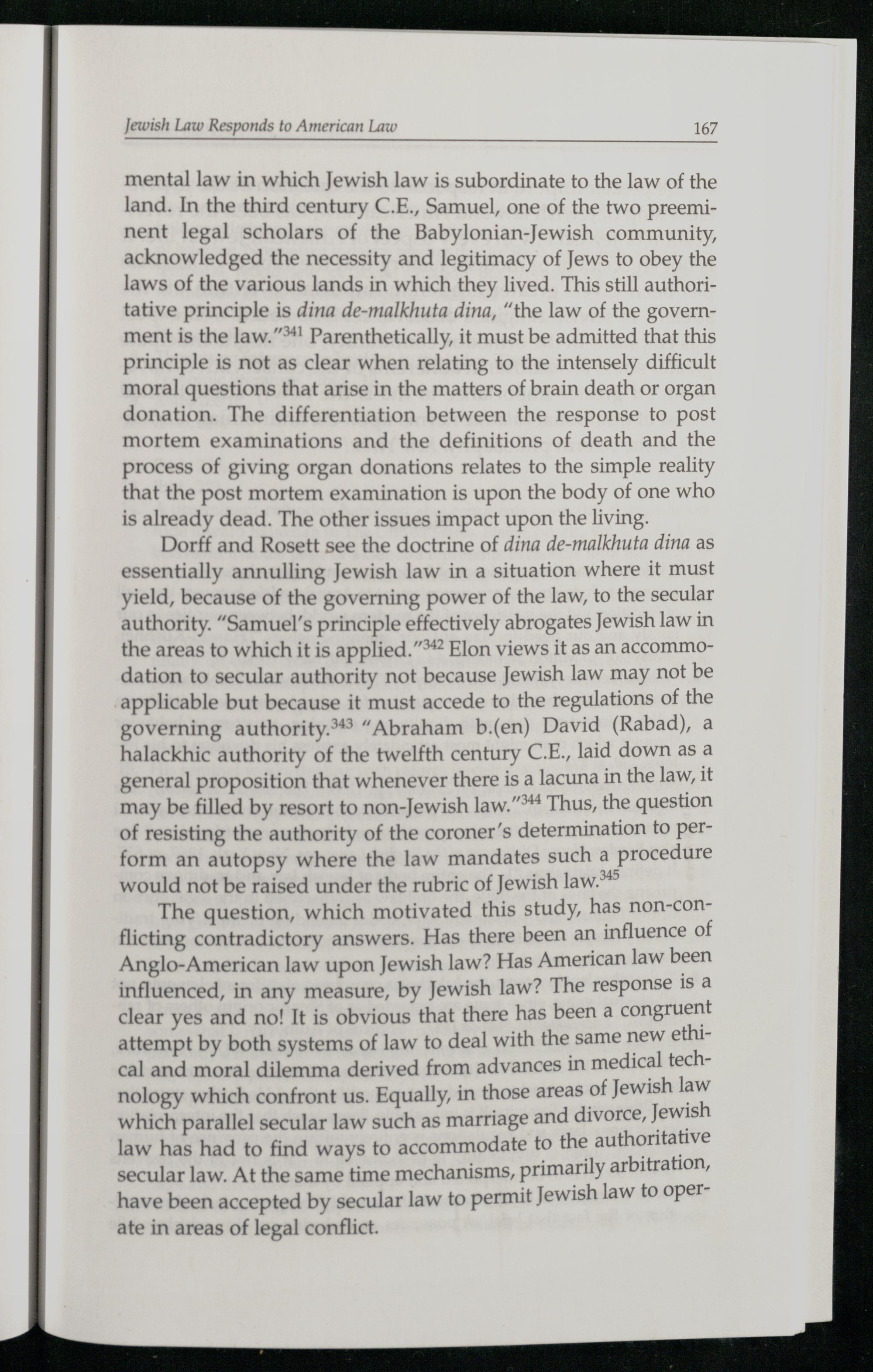 Dorff and Rosett see the doctrine of dina de-malkhuta dina as essentially annulling Jewish law in a situation where it must yield, because of the governing power of the law, to the secular authority.“Samuel's principle effectively abrogates Jewish law in the areas to which it is applied.”** Elon views it as an accommodation to secular authority not because Jewish law may not be applicable but because it must accede to the regulations of the governing authority.**®“Abraham b.(en) David(Rabad), a halackhic authority of the twelfth century C.E., laid down as a general proposition that whenever there is a lacuna in the law, it may be filled by resort to non-Jewish law.”** Thus, the question of resisting the authority of the coroner's determination to perform an autopsy where the law mandates such a procedure would not be raised under the rubric of Jewish law.*®