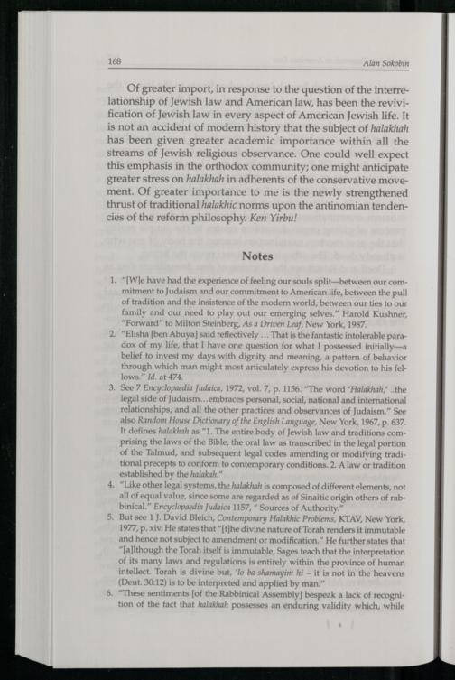 streams of Jewish religious observance. One could well expect this emphasis in the orthodox community; one might anticipate greater stress on halakhah in adherents of the conservative movement. Of greater importance to me is the newly strengthened thrust of traditional halakhic norms upon the antinomian tendencies of the reform philosophy. Ken Yirbu!