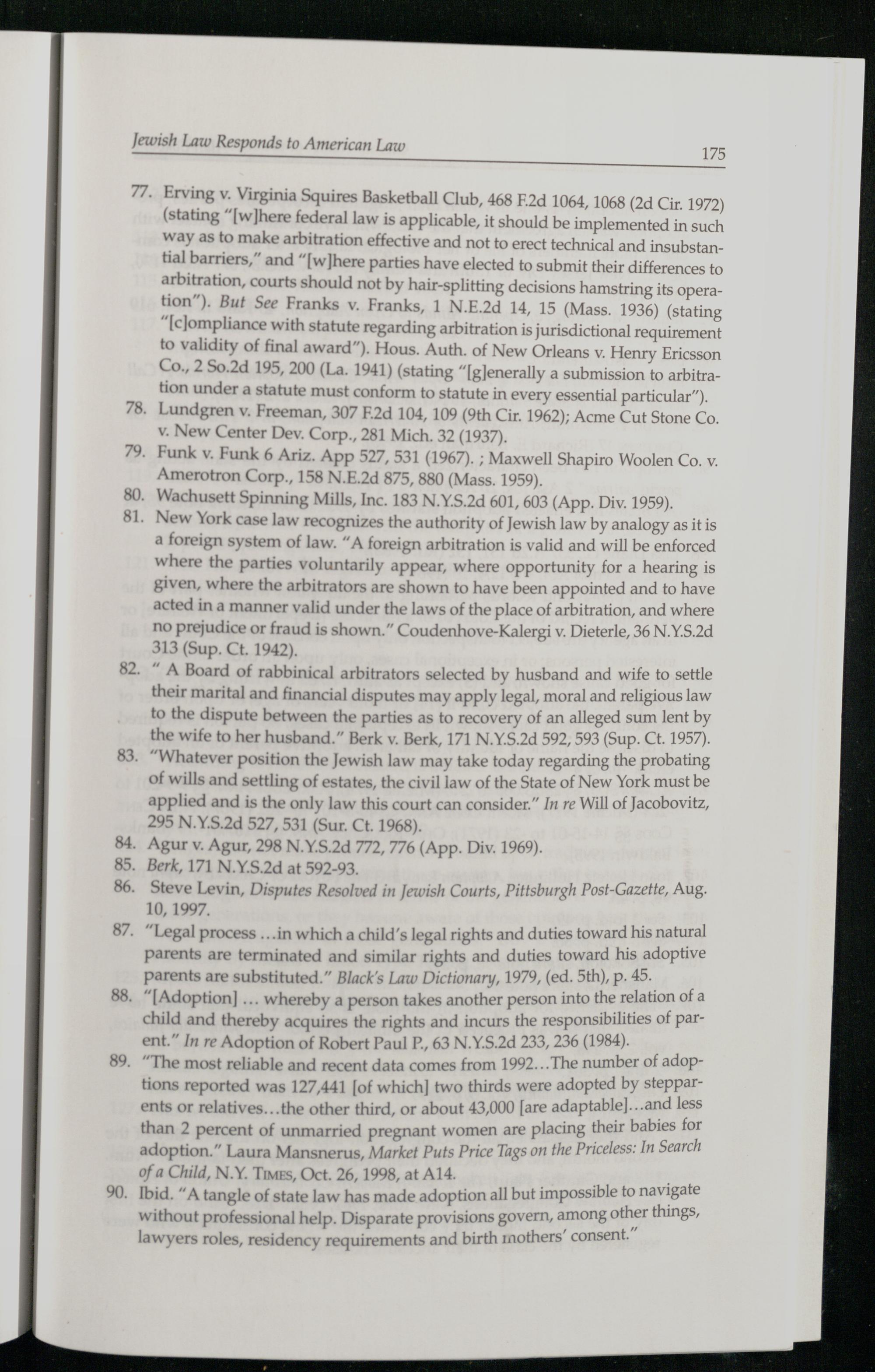 “ A Board of rabbinical arbitrators selected by husband and wife to settle their marital and financial disputes may apply legal, moral and religious law to the dispute between the parties as to recovery of an alleged sum lent by the wife to her husband.” Berk v. Berk, 171 N.Y.5.2d 592, 593(Sup. Ct. 1957). “Whatever position the Jewish law may take today regarding the probating of wills and settling of estates, the civil law of the State of New York must be applied and is the only law this court can consider.” In re Will of Jacobovitz, 295 N.Y.S.2d 527, 531(Sur. Ct. 1968).