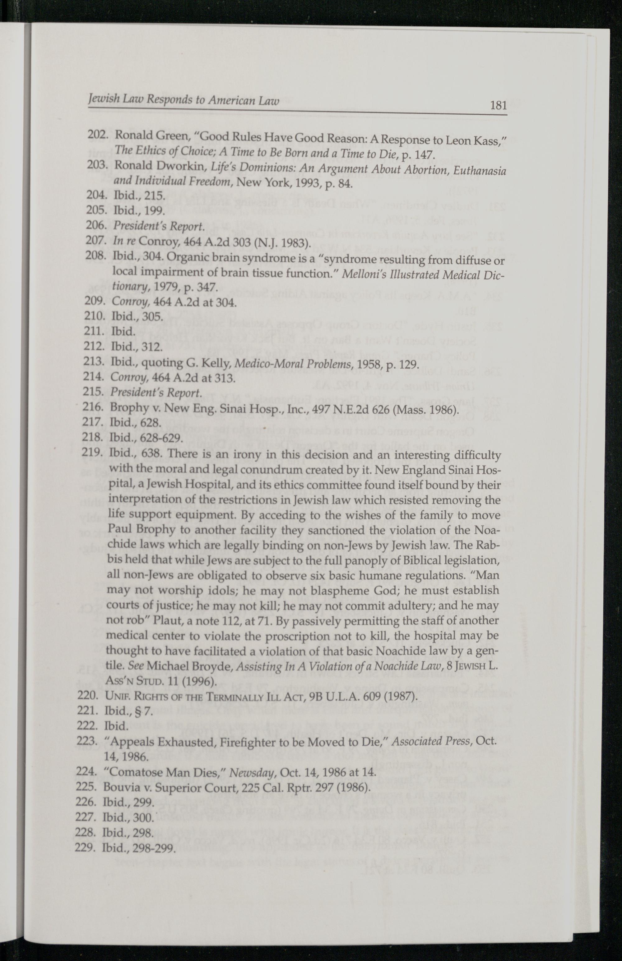 with the moral and legal conundrum created by it. New England Sinai Hospital, a Jewish Hospital, and its ethics committee found itself bound by their interpretation of the restrictions in Jewish law which resisted removing the life support equipment. By acceding to the wishes of the family to move Paul Brophy to another facility they sanctioned the violation of the Noachide laws which are legally binding on non-Jews by Jewish law. The Rab bis held that while Jews are subject to the full panoply of Biblical legislation, all non-Jews are obligated to observe six basic humane regulations.“Man may not worship idols; he may not blaspheme God ; he must establish courts of justice; he may not kill; he may not commit adultery; and he may not rob” Plaut, a note 112, at 71. By passively permitting the staff of another medical center to violate the proscription not to kill, the hospital may be thought to have facilitated a violation of that basic Noachide law by a gentile. See Michael Broyde , Assisting In A Violation of a Noachide Law, 8 JEwisH L. Ass’N Stub. 11(1996).