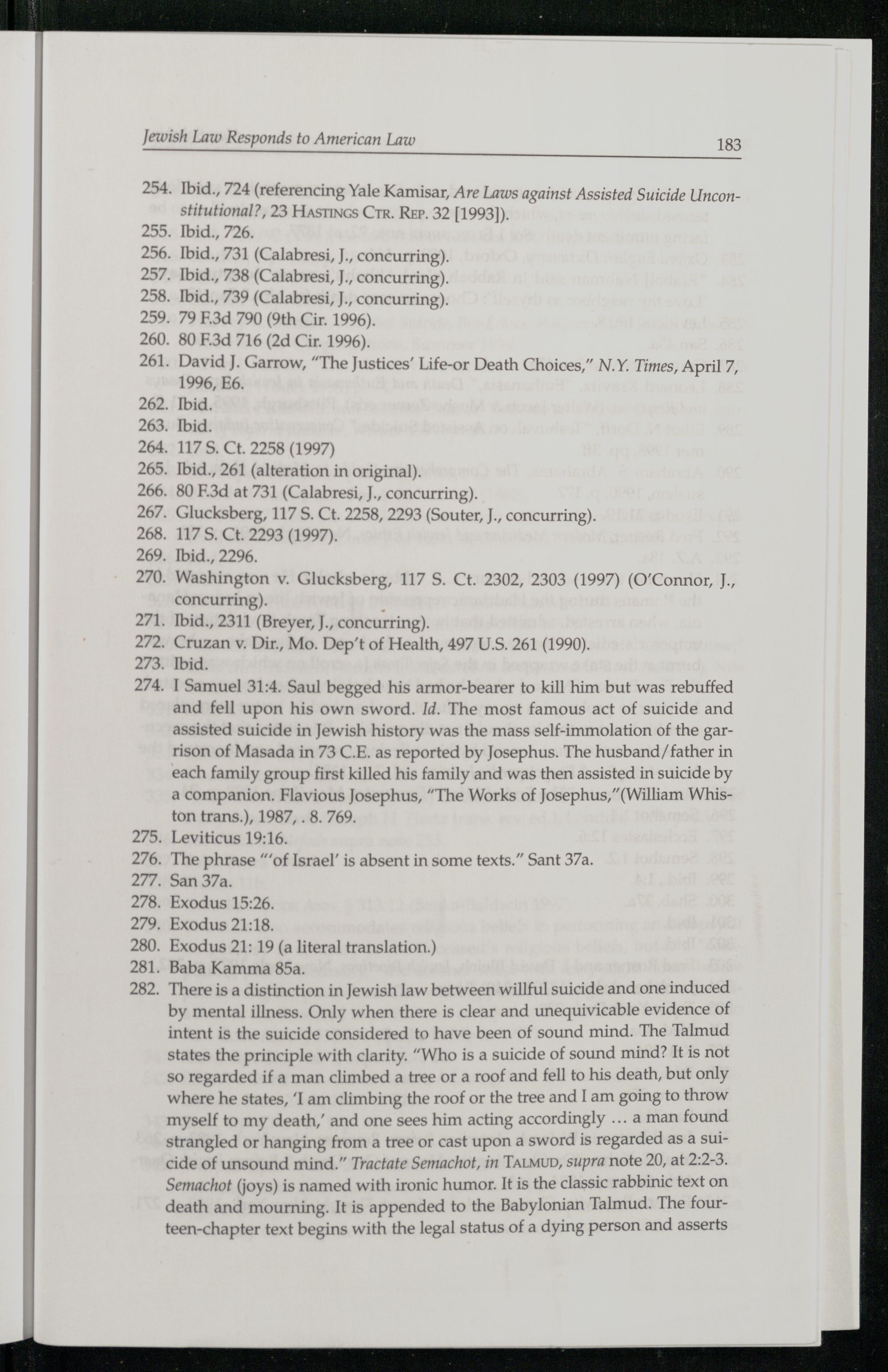 There is a distinction in Jewish law between willful suicide and one induced by mental illness. Only when there is clear and unequivicable evidence of intent is the suicide considered to have been of sound mind. The Talmud states the principle with clarity.“Who is a suicide of sound mind? It is not so regarded if a man climbed a tree or a roof and fell to his death, but only where he states,‘I am climbing the roof or the tree and[ am going to throw myself to my death,” and one sees him acting accordingly... aman found strangled or hanging from a tree or cast upon a sword is regarded as a suicide of unsound mind.” Tractate Semachot, in TALMUD , supra note 20, at 2:2-3. Semachot(joys) is named with ironic humor. It is the classic rabbinic text on death and mourning. It is appended to the Babylonian Talmud . The fourteen-chapter text begins with the legal status of a dying person and asserts