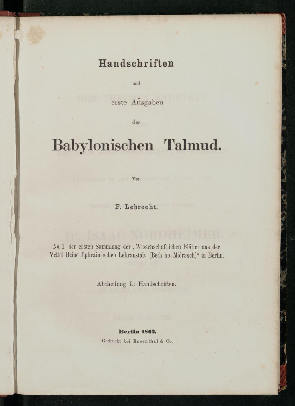 Handschriften und erste Ausgaben des Babylonischen Talmud. Von F. Lebrecht. D ISAAC NORDHEIMER No. 1. der ersten Sammlung der ,, Wissenschaftlichen Blätter aus der Veitel Heine Ephraim 'schen Lehranstalt( Beth ha- Midrasch)" in Berlin . Abtheilung I.: Handschriften. IN Berlin 1862. Gedruckt bei Rosenthal& Co.