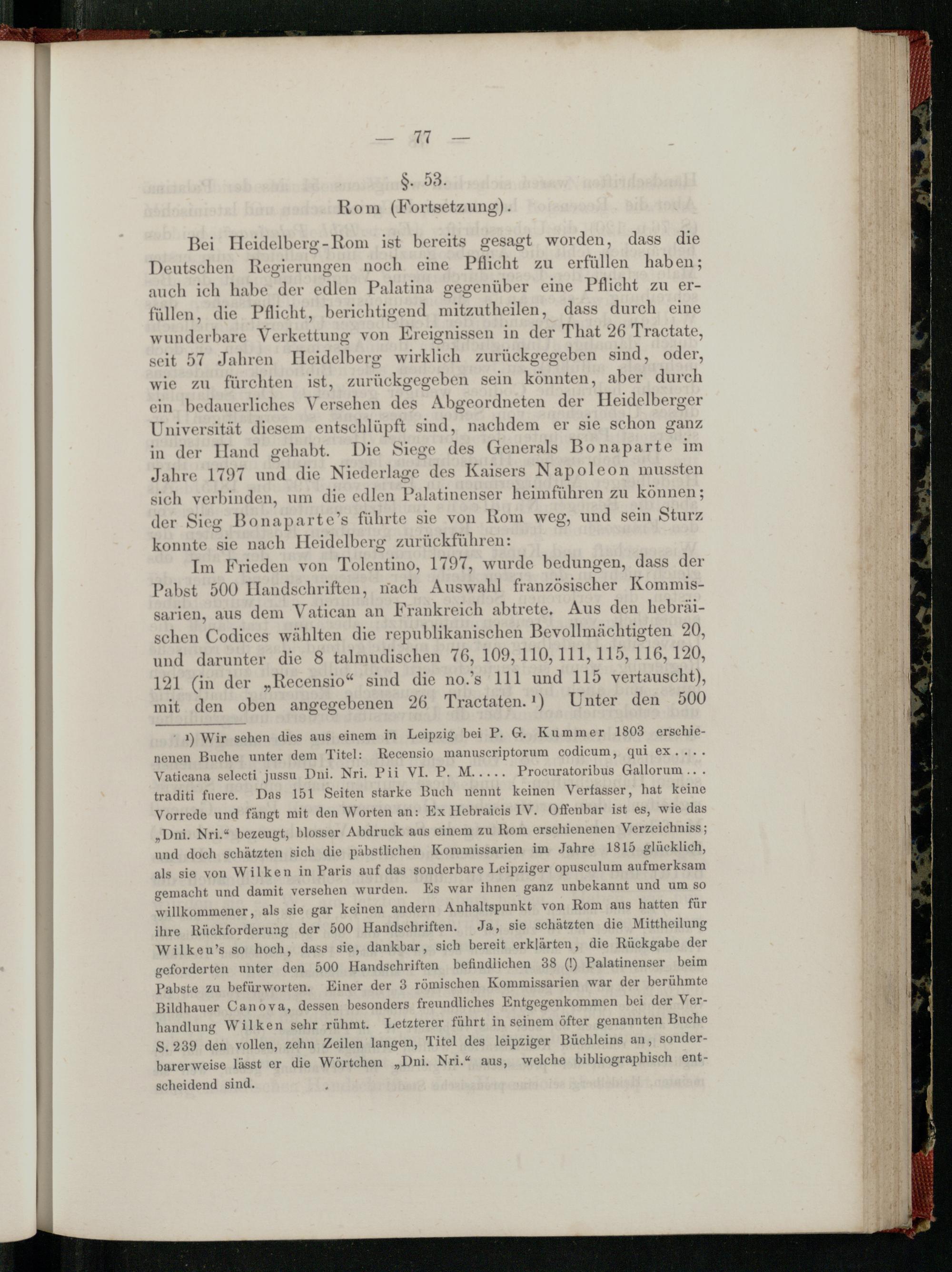 Bei Heidelberg- Rom ist bereits gesagt worden, dass die Deutschen Regierungen noch eine Pflicht zu erfüllen haben; auch ich habe der edlen Palatina gegenüber eine Pflicht zu erfüllen, die Pflicht, berichtigend mitzutheilen, dass durch eine wunderbare Verkettung von Ereignissen in der That 26 Tractate, seit 57 Jahren Heidelberg wirklich zurückgegeben sind, oder, wie zu fürchten ist, zurückgegeben sein könnten, aber durch ein bedauerliches Versehen des Abgeordneten der Heidelberger Universität diesem entschlüpft sind, nachdem er sie schon ganz in der Hand gehabt. Die Siege des Generals Bonaparte im Jahre 1797 und die Niederlage des Kaisers Napoleon mussten sich verbinden, um die edlen Palatinenser heimführen zu können; der Sieg Bonaparte's führte sie von Rom weg, und sein Sturz konnte sie nach Heidelberg zurückführen: