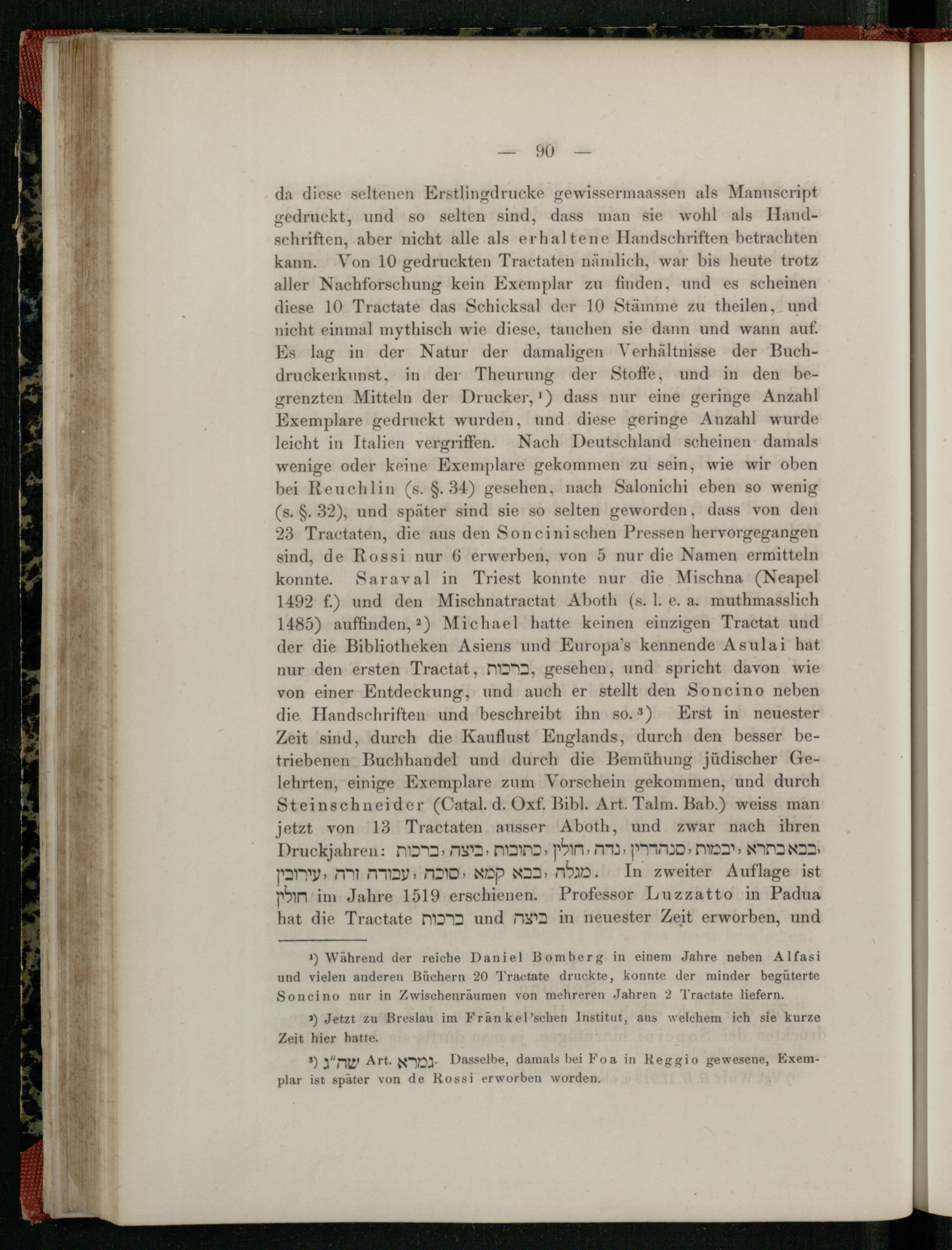 da diese seltenen Erstlingdrucke gewissermaassen als Manuscript gedruckt, und so selten sind, dass man sie wohl als Handschriften, aber nicht alle als erhaltene Handschriften betrachten kann. Von 10 gedruckten Tractaten nämlich, war bis heute trotz aller Nachforschung kein Exemplar zu finden, und es scheinen diese 10 Tractate das Schicksal der 10 Stämme zu theilen, und nicht einmal mythisch wie diese, tauchen sie dann und wann auf. Es lag in der Natur der damaligen Verhältnisse der Buchdruckerkunst, in der Theurung der Stoffe, und in den begrenzten Mitteln der Drucker, 1) dass nur eine geringe Anzahl Exemplare gedruckt wurden, und diese geringe Anzahl wurde leicht in Italien vergriffen. Nach Deutschland scheinen damals wenige oder keine Exemplare gekommen zu sein, wie wir oben bei Reuchlin( s.§. 34) gesehen, nach Salonichi eben so wenig ( s.§. 32), und später sind sie so selten geworden, dass von den 23 Tractaten, die aus den Soncinischen Pressen hervorgegangen sind, de Rossi nur 6 erwerben, von 5 nur die Namen ermitteln konnte. Saraval in Triest konnte nur die Mischna ( Neapel 1492 f.) und den Mischnatractat Aboth( s. 1. e. a. muthmasslich 1485) auffinden, 2) Michael hatte keinen einzigen Tractat und der die Bibliotheken Asiens und Europa's kennende Asulai hat nur den ersten Tractat, n, gesehen, und spricht davon wie von einer Entdeckung, und auch er stellt den Soncino neben die Handschriften und beschreibt ihn so. 3) Erst in neuester Zeit sind, durch die Kauflust Englands, durch den besser betriebenen Buchhandel und durch die Bemühung jüdischer Gelehrten, einige Exemplare zum Vorschein gekommen, und durch Steinschneider( Catal. d. Oxf. Bibl. Art. Talm. Bab.) weiss man jetzt von 13 Tractaten ausser Aboth, und zwar nach ihren
