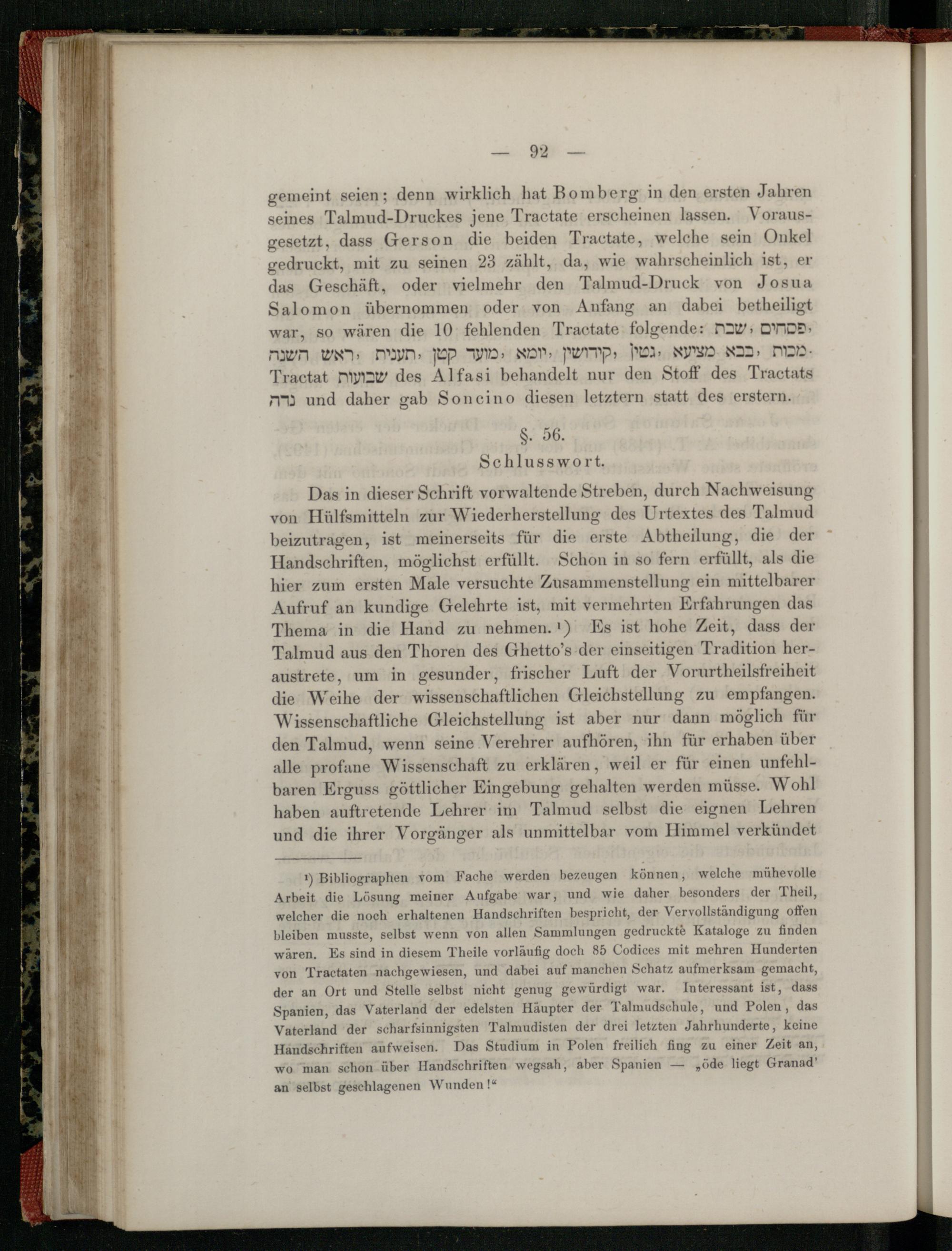 1) Bibliographen vom Fache werden bezeugen können, welche mühevolle Arbeit die Lösung meiner Aufgabe war, und wie daher besonders der Theil, welcher die noch erhaltenen Handschriften bespricht, der Vervollständigung offen bleiben musste, selbst wenn von allen Sammlungen gedruckte Kataloge zu finden wären. Es sind in diesem Theile vorläufig doch 85 Codices mit mehren Hunderten von Tractaten nachgewiesen, und dabei auf manchen Schatz aufmerksam gemacht, der an Ort und Stelle selbst nicht genug gewürdigt war. Interessant ist, dass Spanien , das Vaterland der edelsten Häupter der Talmudschule, und Polen , das Vaterland der scharfsinnigsten Talmudisten der drei letzten Jahrhunderte, keine Handschriften aufweisen. Das Studium in Polen freilich fing zu einer Zeit an, wo man schon über Handschriften wegsah, aber Spanien