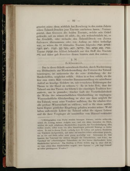 ab Das in dieser Schrift vorwaltende Streben, durch Nachweisung von Hülfsmitteln zur Wiederherstellung des Urtextes des Talmud beizutragen, ist meinerseits für die erste Abtheilung, die der Handschriften, möglichst erfüllt. Schon in so fern erfüllt, als die hier zum ersten Male versuchte Zusammenstellung ein mittelbarer Aufruf an kundige Gelehrte ist, mit vermehrten Erfahrungen das Thema in die Hand zu nehmen. 1) Es ist hohe Zeit, dass der Talmud aus den Thoren des Ghetto's der einseitigen Tradition heraustrete, um in gesunder, frischer Luft der Vorurtheilsfreiheit die Weihe der wissenschaftlichen Gleichstellung zu empfangen. Wissenschaftliche Gleichstellung ist aber nur dann möglich für den Talmud, wenn seine Verehrer aufhören, ihn für erhaben über alle profane Wissenschaft zu erklären, weil er für einen unfehlbaren Erguss göttlicher Eingebung gehalten werden müsse. Wohl haben auftretende Lehrer im Talmud selbst die eignen Lehren und die ihrer Vorgänger als unmittelbar vom Himmel verkündet