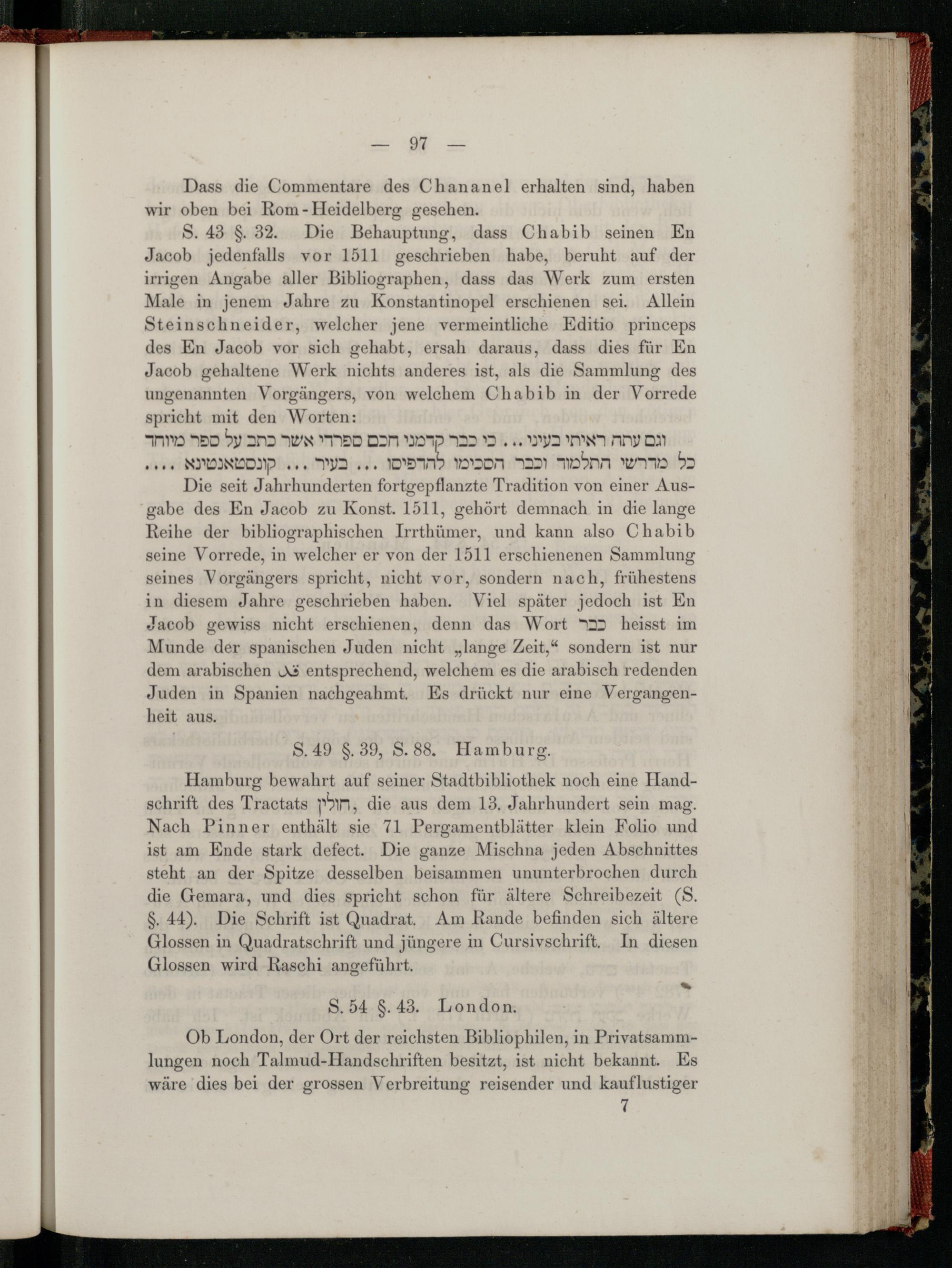 S. 43§. 32. Die Behauptung, dass Chabib seinen En Jacob jedenfalls vor 1511 geschrieben habe, beruht auf der irrigen Angabe aller Bibliographen, dass das Werk zum ersten Male in jenem Jahre zu Konstantinopel erschienen sei. Allein Steinschneider, welcher jene vermeintliche Editio princeps des En Jacob vor sich gehabt, ersah daraus, dass dies für En Jacob gehaltene Werk nichts anderes ist, als die Sammlung des ungenannten Vorgängers, von welchem Chabib in der Vorrede spricht mit den Worten: as a hoblow Hodoisted