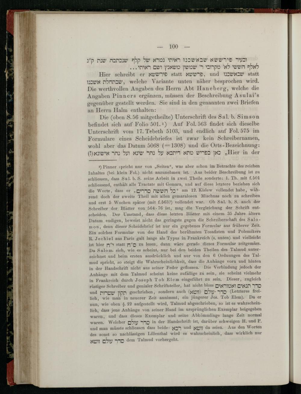 Die( oben S. 56 mitgetheilte) Unterschrift des Sal. b. Simson befindet sich auf Folio 501.) Auf Fol. 563 findet sich dieselbe Unterschrift vom 17. Tebeth 5103, und endlich auf Fol. 575 im Formulare eines Scheidebriefes ist zwar kein Schreibernamen, wohl aber das Datum 5068(-1308) und die Orts- Bezeichnung: