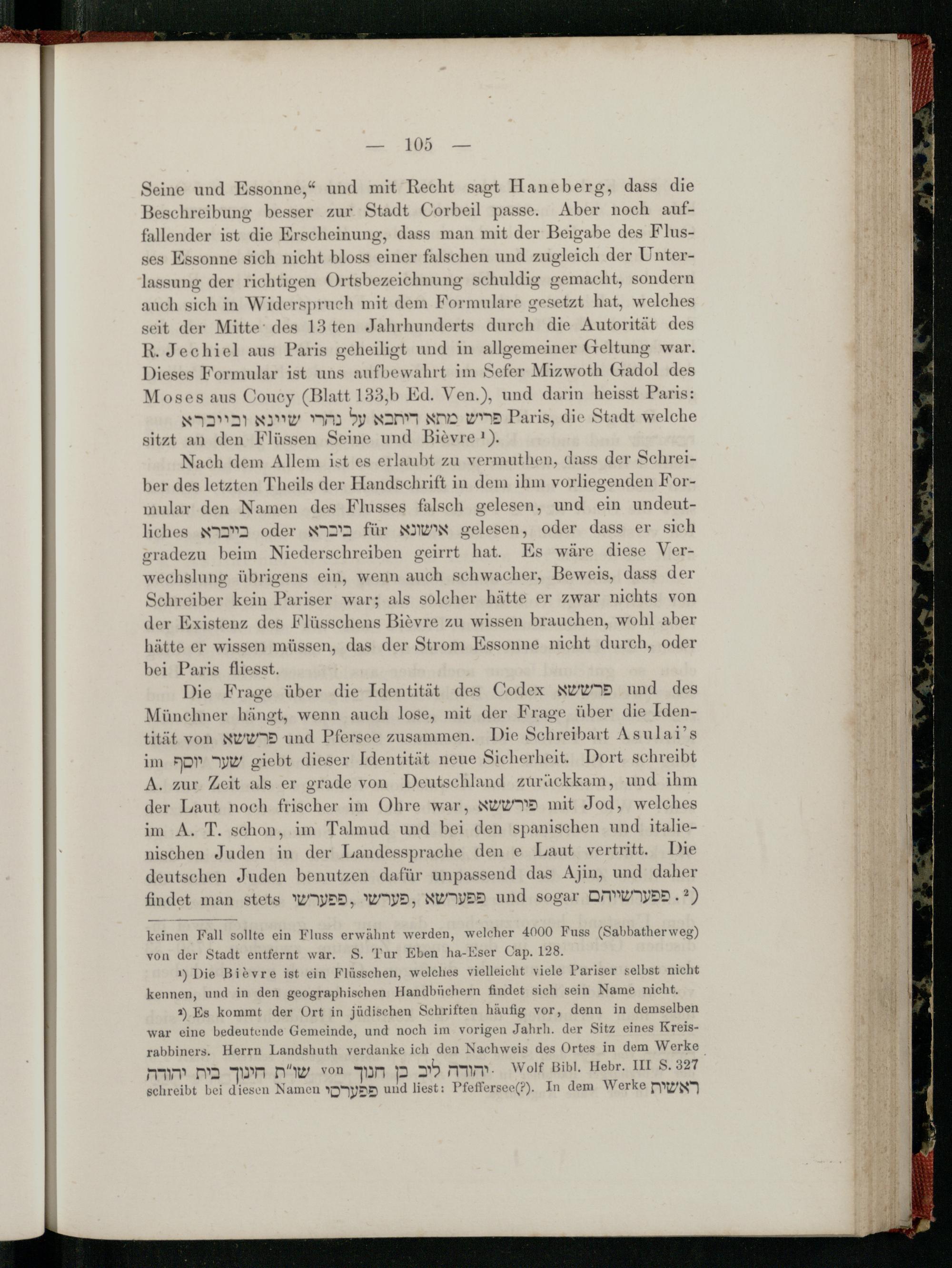 Seine und Essonne ," und mit Recht sagt Haneberg, dass die Beschreibung besser zur Stadt Corbeil passe. Aber noch auffallender ist die Erscheinung, dass man mit der Beigabe des Flus ses Essonne sich nicht bloss einer falschen und zugleich der Unterlassung der richtigen Ortsbezeichnung schuldig gemacht, sondern auch sich in Widerspruch mit dem Formulare gesetzt hat, welches seit der Mitte des 13 ten Jahrhunderts durch die Autorität des R. Jechiel aus Paris geheiligt und in allgemeiner Geltung war. Dieses Formular ist uns aufbewahrt im Sefer Mizwoth Gadol des Moses aus Coucy( Blatt 133, b Ed. Ven.), und darin heisst Paris :