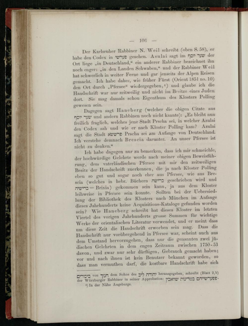 Der Karlsruher Rabbiner N. Weil schreibt( oben S. 58), er habe den Codex in wy gesehen. Asulai sagt im or yw der Ort liege in Deutschland ," ein anderer Rabbiner bezeichnet ihn noch enger: ,, in den Landen Schwaben," und der Rabbiner Weil hat schwerlich in weiter Ferne und gar jenseits der Alpen Reisen gemacht. Ich habe daher, wie früher Fürst( Orient 1851 no. 10) den Ort durch„ Pfersee " wiedergegeben, 1) und glaube ich die Handschrift war nur zeitweilig und nicht im Besitze eines Juden dort. Sie mag damals schon Eigenthum des Klosters Polling gewesen sein.