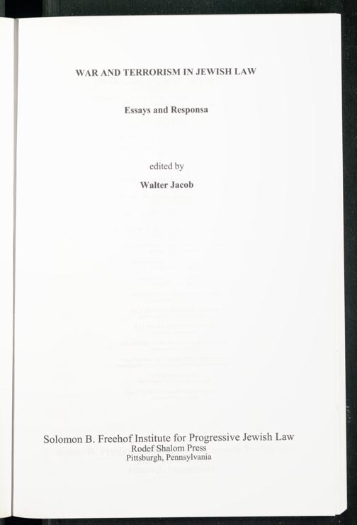 WAR AND TERRORISM IN JEWISH LAW Essays and Responsa edited by Walter Jacob Solomon B. Freehof Institute for Progressive Jewish Law Rodef Shalom Press Pittsburgh , Pennsylvania