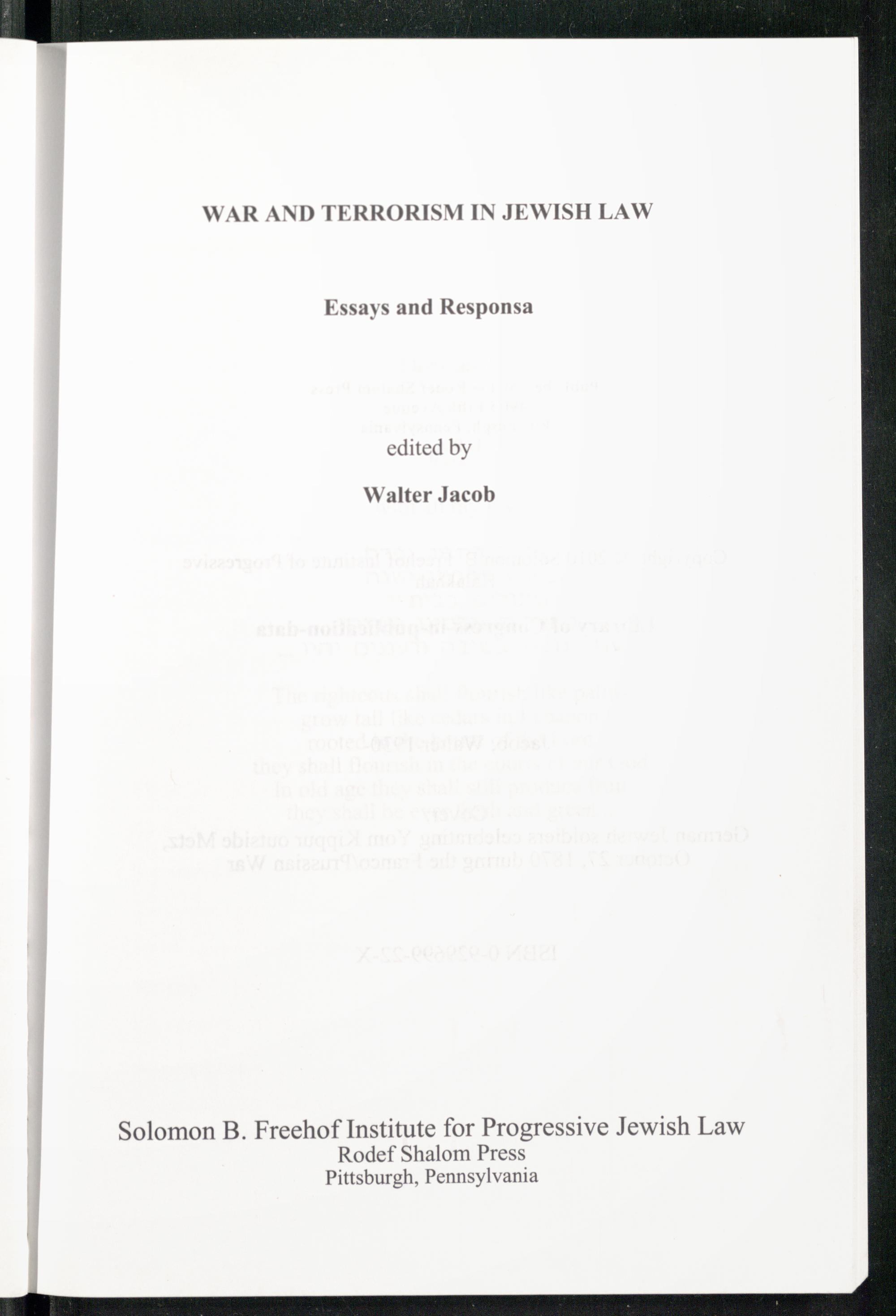 WAR AND TERRORISM IN JEWISH LAW Essays and Responsa edited by Walter Jacob Solomon B. Freehof Institute for Progressive Jewish Law Rodef Shalom Press Pittsburgh , Pennsylvania