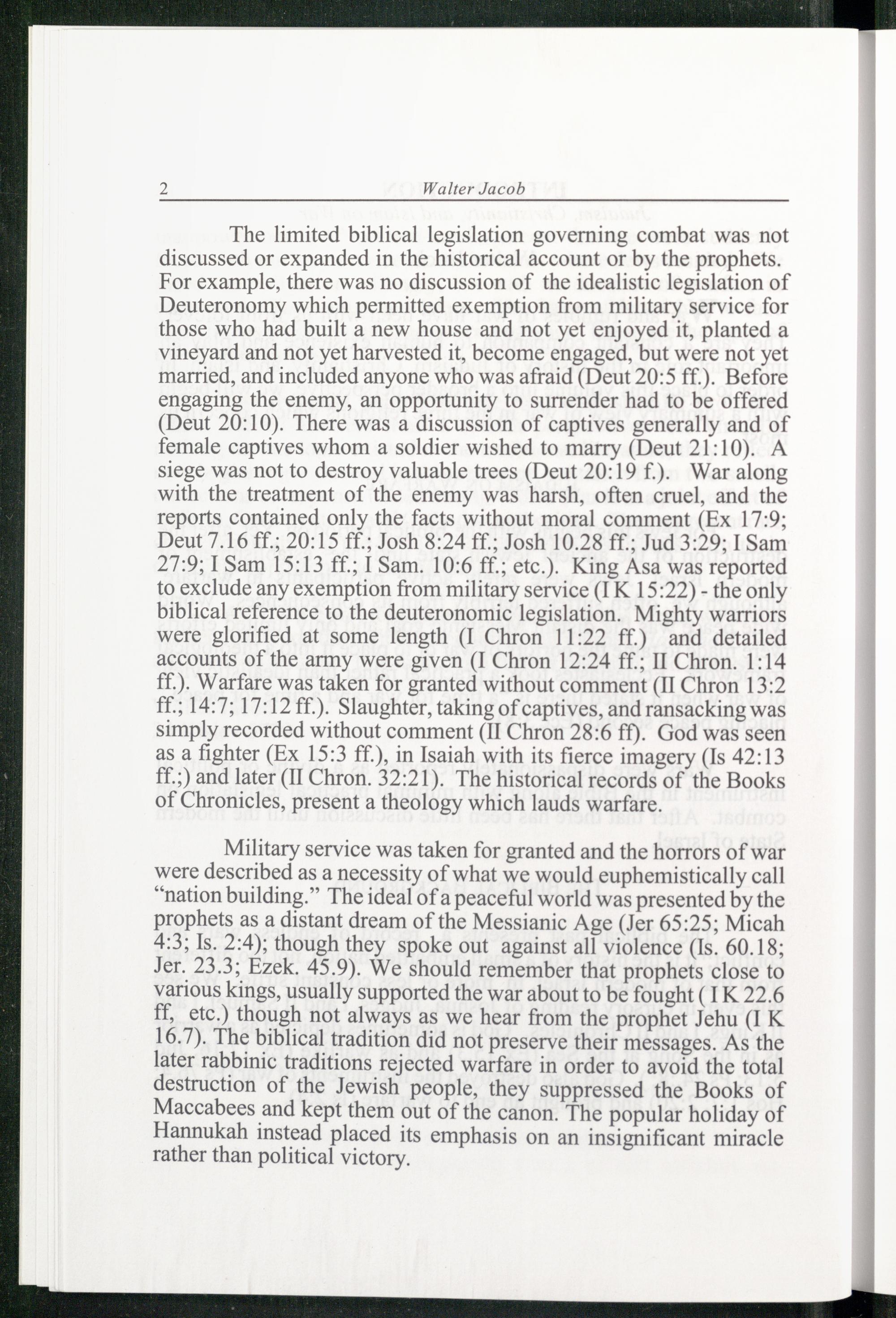 The limited biblical legislation governing combat was not discussed or expanded in the historical account or by the prophets. For example, there was no discussion of the idealistic legislation of Deuteronomy which permitted exemption from military service for those who had built a new house and not yet enjoyed it, planted a vineyard and not yet harvested it, become engaged, but were not yet married, and included anyone who was afraid(Deut 20:5 ff.). Before engaging the enemy, an opportunity to surrender had to be offered (Deut 20:10). There was a discussion of captives generally and of female captives whom a soldier wished to marry(Deut 21:10). A siege was not to destroy valuable trees(Deut 20:19 f.). War along with the treatment of the enemy was harsh, often cruel, and the reports contained only the facts without moral comment(Ex 17:9; Deut 7.16 ff.; 20:15 ff.; Josh 8:24 ff.; Josh 10.28 ff; Jud 3:29; I Sam 27:9; I Sam 15:13 ff; I Sam. 10:6 ff.; etc.). King Asa was reported to exclude any exemption from military service(IK 15:22)- the only biblical reference to the deuteronomic legislation. Mighty warriors were glorified at some length(I Chron 11:22 ff.) and detailed accounts of the army were given(I Chron 12:24 ff; II Chron. 1:14 ff.). Warfare was taken for granted without comment(II Chron 13:2 ff.; 14:7; 17:12 ff). Slaughter, taking of captives, and ransacking was simply recorded without comment(II Chron 28:6 ff). God was seen as a fighter(Ex 15:3 ff), in Isaiah with its fierce imagery(Is 42:13 ff.;) and later(II Chron. 32:21). The historical records of the Books of Chronicles , present a theology which lauds warfare.