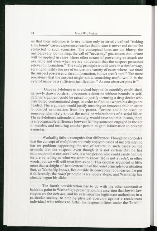 Warhaftig fails to recognize that difference. Though he concedes that the concept of rodef does not truly apply to cases of uncertainty, he has no problem supporting the use of torture in such cases on the grounds that the suspect, even though it is not certain that he has information that can save lives, is a bad person who could easily halt the torture by telling us what we want to know. He is not a rodef, in other words, but we will still treat him as one. This circular argument is little more than a sleight-of-hand extension of the rodef principle to a situation that, as Warhaftig knows, lies outside its conceptual boundaries. To put it differently, the rodef principle is a slippery slope, and Warhaftig has already begun his slide.