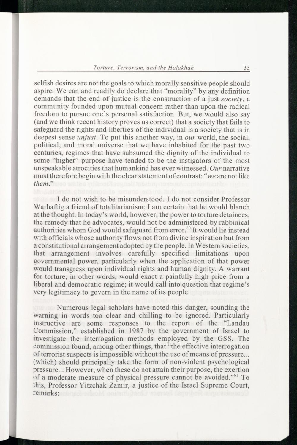 I do not wish to be misunderstood. I do not consider Professor Warhaftig a friend of totalitarianism; I am certain that he would blanch at the thought. In today’s world, however, the power to torture detainees, the remedy that he advocates, would not be administered by rabbinical authorities whom God would safeguard from error.® It would lie instead with officials whose authority flows not from divine inspiration but from a constitutional arrangement adopted by the people. In Western societies, that arrangement involves carefully specified limitations upon governmental power, particularly when the application of that power would transgress upon individual rights and human dignity. A warrant for torture, in other words, would exact a painfully high price from a liberal and democratic regime; it would call into question that regime’s very legitimacy to govern in the name of its people.