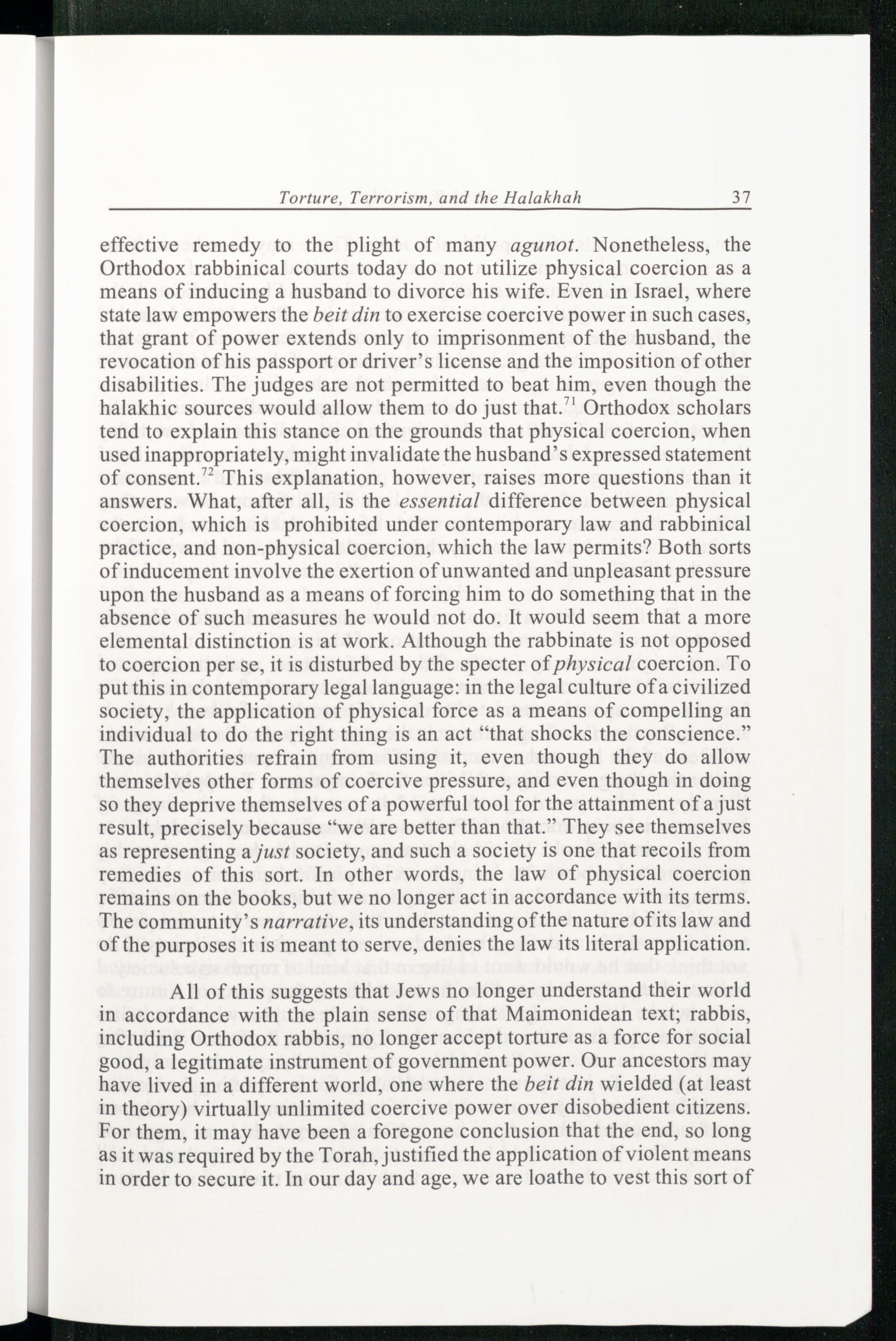 effective remedy to the plight of many agunot. Nonetheless, the Orthodox rabbinical courts today do not utilize physical coercion as a means of inducing a husband to divorce his wife. Even in Israel , where state law empowers the beit din to exercise coercive power in such cases, that grant of power extends only to imprisonment of the husband, the revocation of his passport or driver’s license and the imposition of other disabilities. The judges are not permitted to beat him, even though the halakhic sources would allow them to do just that.” Orthodox scholars tend to explain this stance on the grounds that physical coercion, when used inappropriately, might invalidate the husband’s expressed statement of consent.”” This explanation, however, raises more questions than it answers. What, after all, is the essential difference between physical coercion, which is prohibited under contemporary law and rabbinical practice, and non-physical coercion, which the law permits? Both sorts of inducement involve the exertion of unwanted and unpleasant pressure upon the husband as a means of forcing him to do something that in the absence of such measures he would not do. It would seem that a more elemental distinction is at work. Although the rabbinate is not opposed to coercion per se, it is disturbed by the specter of physical coercion. To put this in contemporary legal language: in the legal culture of a civilized society, the application of physical force as a means of compelling an individual to do the right thing is an act“that shocks the conscience.” The authorities refrain from using it, even though they do allow themselves other forms of coercive pressure, and even though in doing so they deprive themselves of a powerful tool for the attainment of a just result, precisely because“we are better than that.” They see themselves as representing a just society, and such a society is one that recoils from remedies of this sort. In other words, the law of physical coercion remains on the books, but we no longer act in accordance with its terms. The community’s narrative, its understanding of the nature ofits law and of the purposes it is meant to serve, denies the law its literal application.