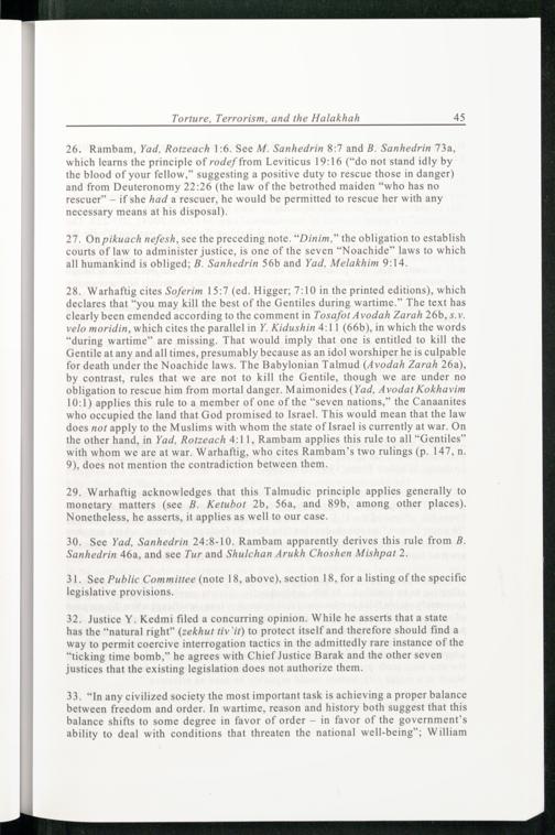 28. Warhaftig cites Soferim 15:7(ed. Higger; 7:10 in the printed editions), which declares that“you may kill the best of the Gentiles during wartime.” The text has clearly been emended according to the comment in Tosafot Avodah Zarah 26b, s.v. velo moridin, which cites the parallel in Y. Kidushin 4:11(66b), in which the words “during wartime” are missing. That would imply that one is entitled to kill the Gentile at any and all times, presumably because as an idol worshiper he is culpable for death under the Noachide laws. The Babylonian Talmud (4vodah Zarah 26a), by contrast, rules that we are not to kill the Gentile, though we are under no obligation to rescue him from mortal danger. Maimonides (Yad, Avodat Kokhavim 10:1) applies this rule to a member of one of the“seven nations,” the Canaanites who occupied the land that God promised to Israel . This would mean that the law does not apply to the Muslims with whom the state of Israel is currently at war. On the other hand, in Yad, Rotzeach 4:11, Rambam applies this rule to all“Gentiles” with whom we are at war. Warhaftig, who cites Rambam ’s two rulings(p. 147, n. 9), does not mention the contradiction between them.