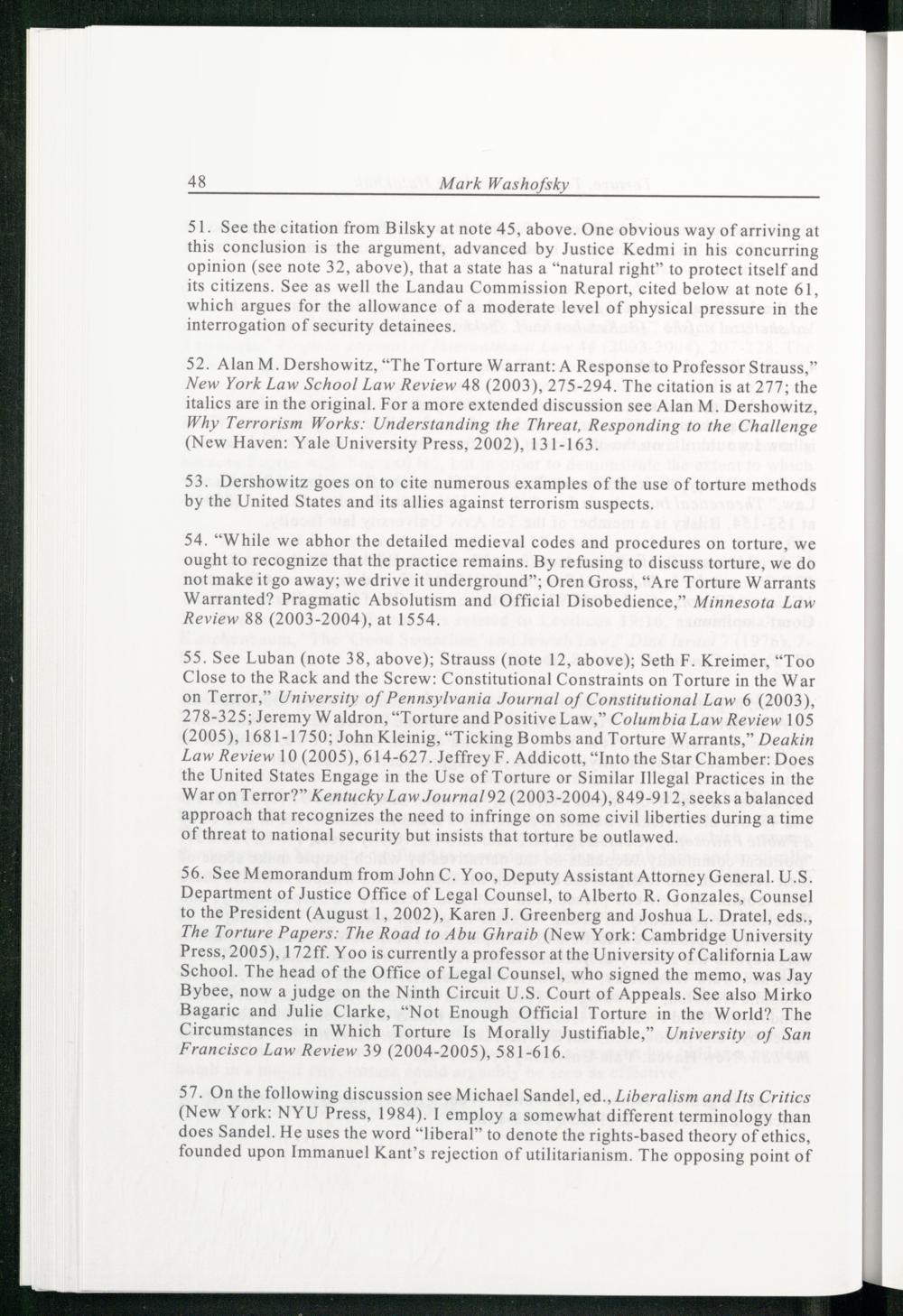 52. Alan M. Dershowitz ,“The Torture Warrant: A Response to Professor Strauss,” New York Law School Law Review 48(2003), 275-294. The citation is at 277: the italics are in the original. For a more extended discussion see Alan M. Dershowitz , Why Terrorism Works: Understanding the Threat, Responding to the Challenge (New Haven : Yale University Press , 2002), 131-163.