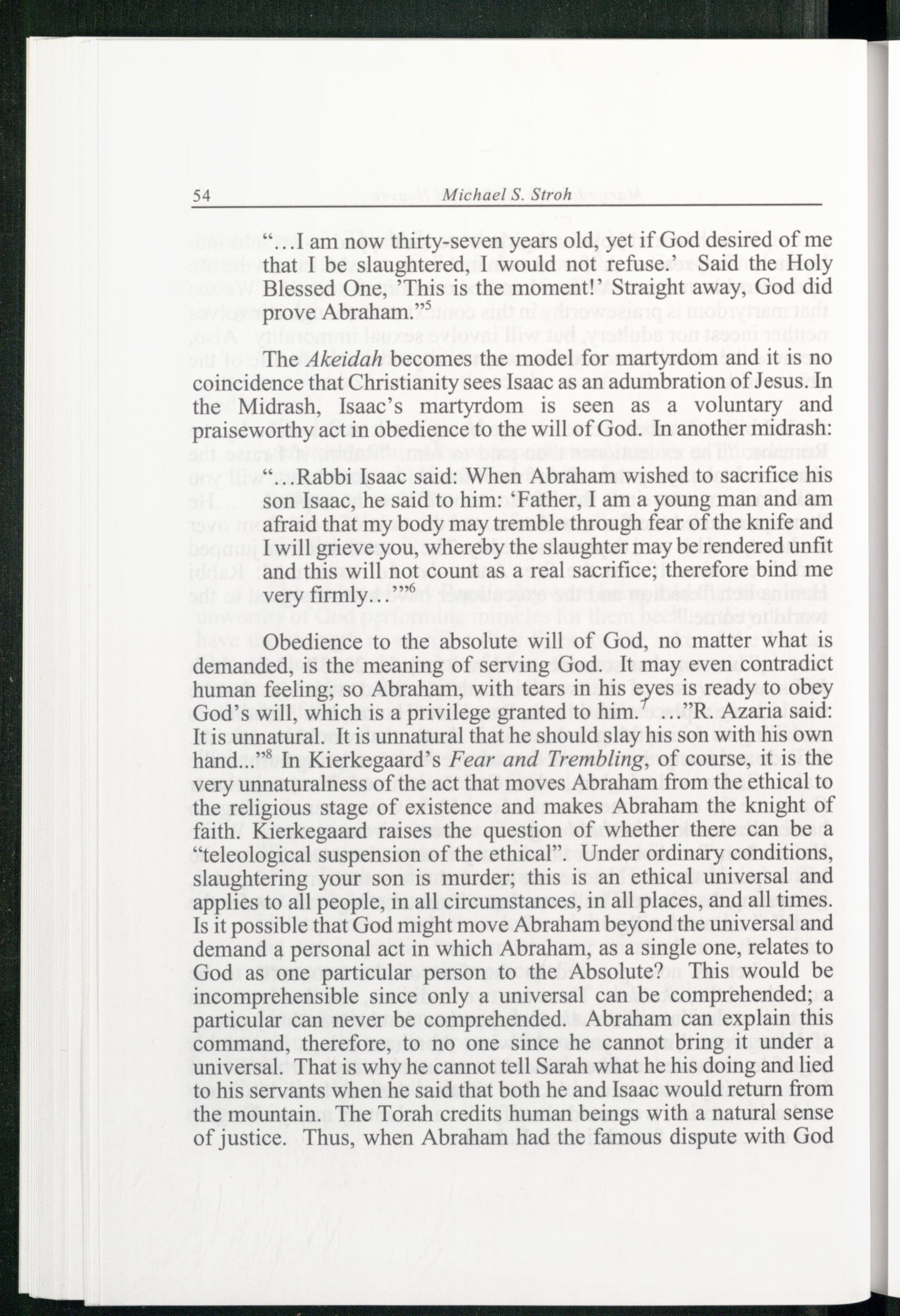 Obedience to the absolute will of God , no matter what is demanded, is the meaning of serving God . It may even contradict human feeling; so Abraham , with tears in his eyes is ready to obey God ’s will, which is a privilege granted to him.”...”R. Azaria said: It is unnatural. It is unnatural that he should slay his son with his own hand...” In Kierkegaard ’s Fear and Trembling, of course, it is the very unnaturalness of the act that moves Abraham from the ethical to the religious stage of existence and makes Abraham the knight of faith. Kierkegaard raises the question of whether there can be a “teleological suspension of the ethical”. Under ordinary conditions, slaughtering your son is murder; this is an ethical universal and applies to all people, in all circumstances, in all places, and all times. Is it possible that God might move Abraham beyond the universal and demand a personal act in which Abraham , as a single one, relates to God as one particular person to the Absolute? This would be incomprehensible since only a universal can be comprehended; a particular can never be comprehended. Abraham can explain this command, therefore, to no one since he cannot bring it under a universal. That is why he cannot tell Sarah what he his doing and lied to his servants when he said that both he and Isaac would return from the mountain. The Torah credits human beings with a natural sense of justice. Thus, when Abraham had the famous dispute with God