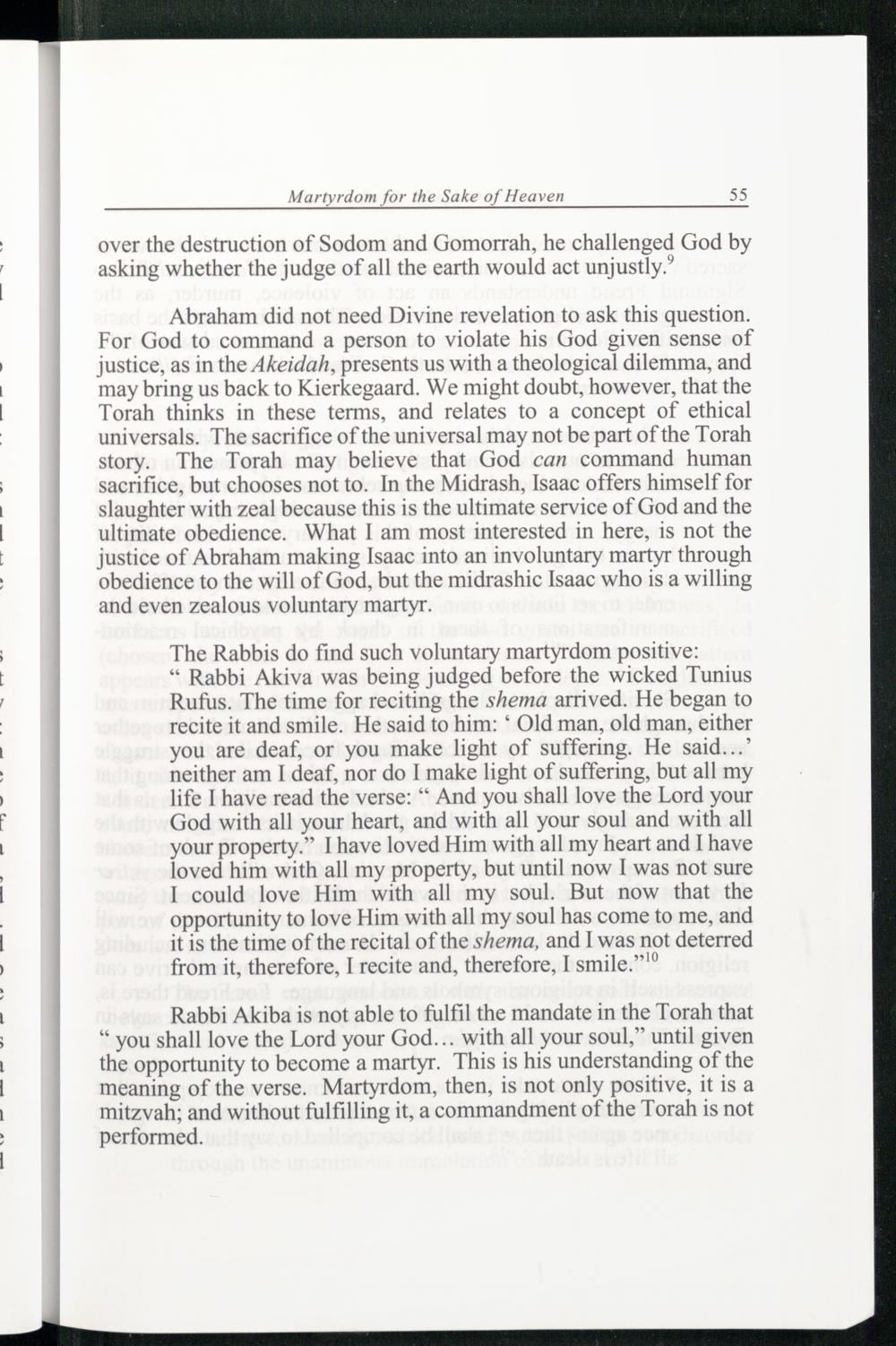 Abraham did not need Divine revelation to ask this question. For God to command a person to violate his God given sense of justice, as in the Akeidah, presents us with a theological dilemma, and may bring us back to Kierkegaard . We might doubt, however, that the Torah thinks in these terms, and relates to a concept of ethical universals. The sacrifice of the universal may not be part of the Torah story. The Torah may believe that God can command human sacrifice, but chooses not to. In the Midrash , Isaac offers himself for slaughter with zeal because this is the ultimate service of God and the ultimate obedience. What I am most interested in here, is not the justice of Abraham making Isaac into an involuntary martyr through obedience to the will of God , but the midrashic Isaac who is a willing and even zealous voluntary martyr.