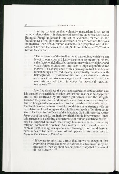 It is my contention that voluntary martyrdom is an act of sacred violence that is, in fact, a ritual sacrifice. In Totem and Taboo Sigmund Freud understands an act of violence, murder, as the founding act of religion and civilization. This act becomes the basis for sacrifice. For Freud , human existence is a perpetual war of the forces of life and the forces of death. So Freud tells us in Civilization And Its Discontents :