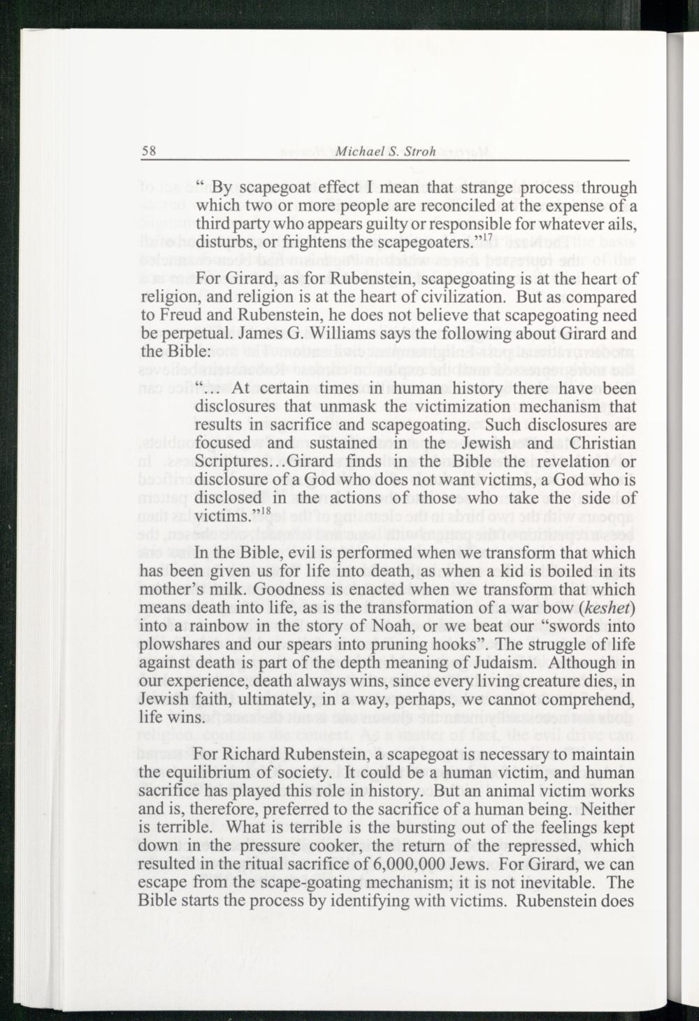 For Girard, as for Rubenstein , scapegoating is at the heart of religion, and religion is at the heart of civilization. But as compared to Freud and Rubenstein , he does not believe that scapegoating need be perpetual. James G. Williams says the following about Girard and the Bible :