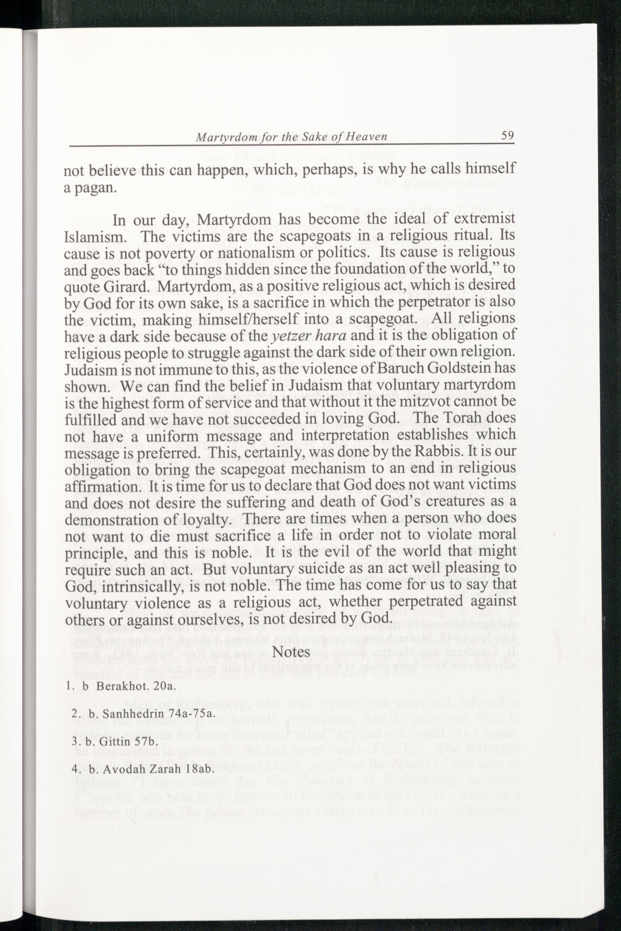 In our day, Martyrdom has become the ideal of extremist Islamism. The victims are the scapegoats in a religious ritual. Its cause is not poverty or nationalism or politics. Its cause is religious and goes back“to things hidden since the foundation of the world,” to quote Girard. Martyrdom, as a positive religious act, which is desired by God for its own sake, is a sacrifice in which the perpetrator is also the victim, making himself/herself into a scapegoat. All religions have a dark side because of the yetzer hara and it is the obligation of religious people to struggle against the dark side of their own religion. Judaism is not immune to this, as the violence of Baruch Goldstein has shown. We can find the belief in Judaism that voluntary martyrdom is the highest form of service and that without it the mitzvot cannot be fulfilled and we have not succeeded in loving God . The Torah does not have a uniform message and interpretation establishes which message is preferred. This, certainly, was done by the Rabbis . It is our obligation to bring the scapegoat mechanism to an end in religious affirmation. It is time for us to declare that God does not want victims and does not desire the suffering and death of God ’s creatures as a demonstration of loyalty. There are times when a person who does not want to die must sacrifice a life in order not to violate moral principle, and this is noble. It is the evil of the world that might require such an act. But voluntary suicide as an act well pleasing to God , intrinsically, is not noble. The time has come for us to say that voluntary violence as a religious act, whether perpetrated against others or against ourselves, is not desired by God .