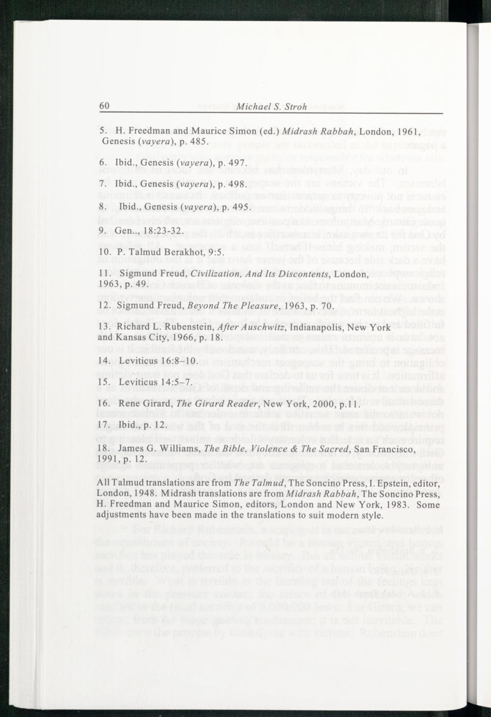 All Talmud translations are from The Talmud, The Soncino Press, I. Epstein , editor, London , 1948. Midrash translations are from Midrash Rabbah, The Soncino Press, H. Freedman and Maurice Simon, editors, London and New York , 1983. Some adjustments have been made in the translations to suit modern style.