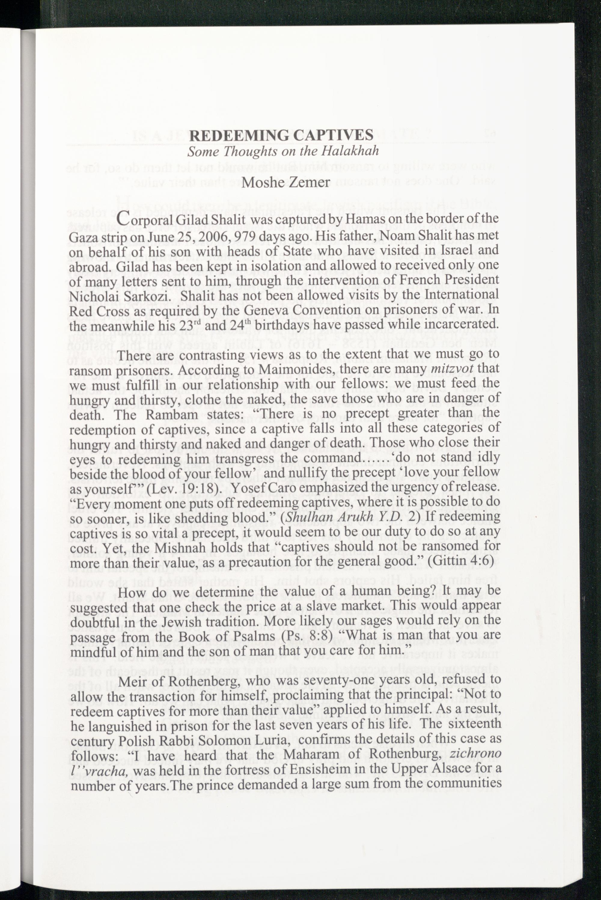 There are contrasting views as to the extent that we must go to ransom prisoners. According to Maimonides , there are many mitzvot that we must fulfill in our relationship with our fellows: we must feed the hungry and thirsty, clothe the naked, the save those who are in danger of death. The Rambam states:“There is no precept greater than the redemption of captives, since a captive falls into all these categories of hungry and thirsty and naked and danger of death. Those who close their eyes to redeeming him transgress the command‘do not stand idly beside the blood of your fellow’ and nullify the precept‘love your fellow as yourself”(Lev. 19:18). Yosef Caro emphasized the urgency of release. “Every moment one puts off redeeming captives, where it is possible to do so sooner, is like shedding blood.”(Shulhan Arukh Y.D. 2) If redeeming captives is so vital a precept, it would seem to be our duty to do so at any cost. Yet, the Mishnah holds that“captives should not be ransomed for more than their value, as a precaution for the general good.”(Gittin 4:6)