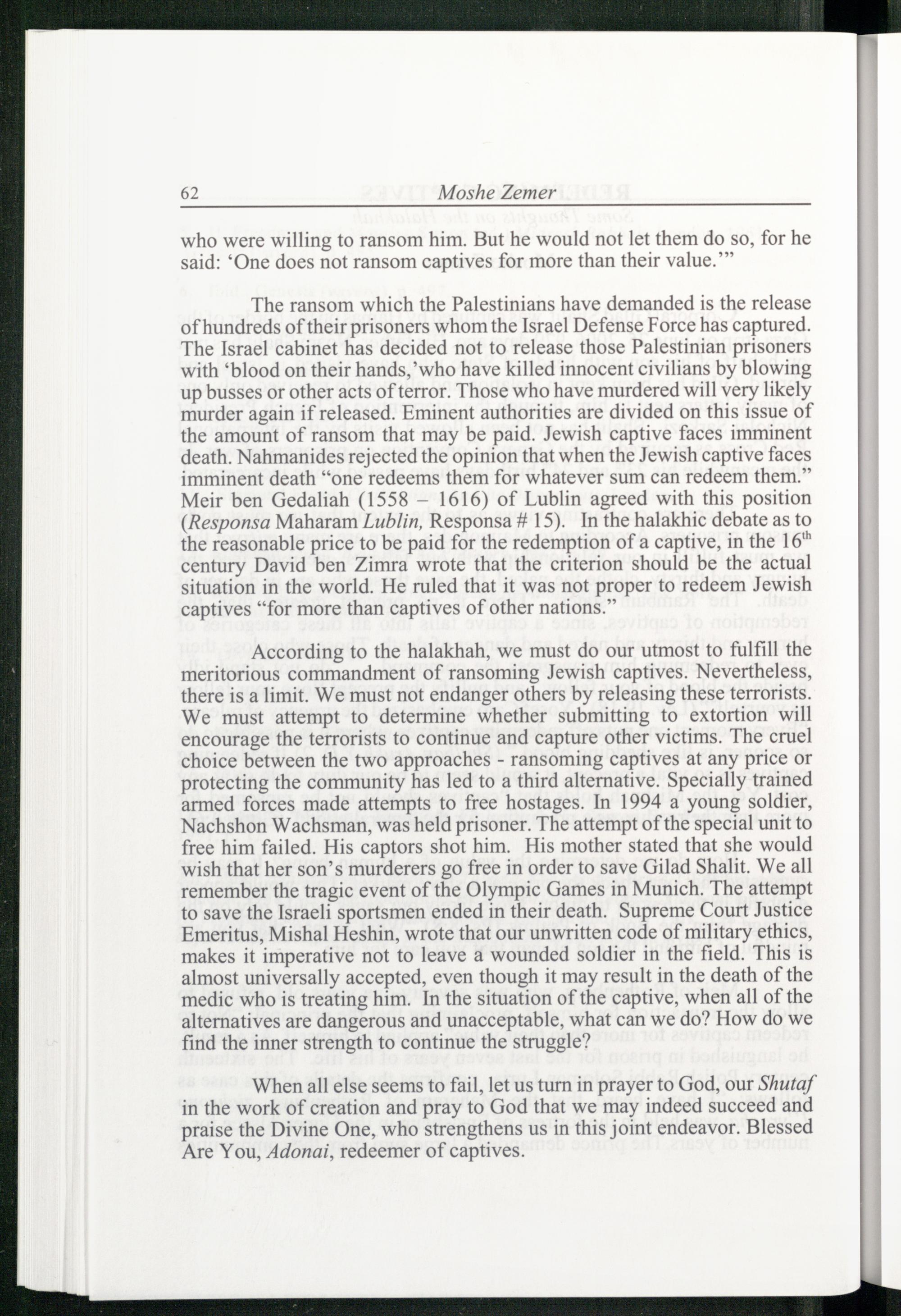 meritorious commandment of ransoming Jewish captives. Nevertheless, there is a limit. We must not endanger others by releasing these terrorists. We must attempt to determine whether submitting to extortion will encourage the terrorists to continue and capture other victims. The cruel choice between the two approaches- ransoming captives at any price or protecting the community has led to a third alternative. Specially trained armed forces made attempts to free hostages. In 1994 a young soldier, Nachshon Wachsman, was held prisoner. The attempt of the special unit to free him failed. His captors shot him. His mother stated that she would wish that her son’s murderers go free in order to save Gilad Shalit . We all remember the tragic event of the Olympic Games in Munich . The attempt to save the Israeli sportsmen ended in their death. Supreme Court Justice Emeritus , Mishal Heshin, wrote that our unwritten code of military ethics, makes it imperative not to leave a wounded soldier in the field. This is almost universally accepted, even though it may result in the death of the medic who is treating him. In the situation of the captive, when all of the alternatives are dangerous and unacceptable, what can we do? How do we find the inner strength to continue the struggle?