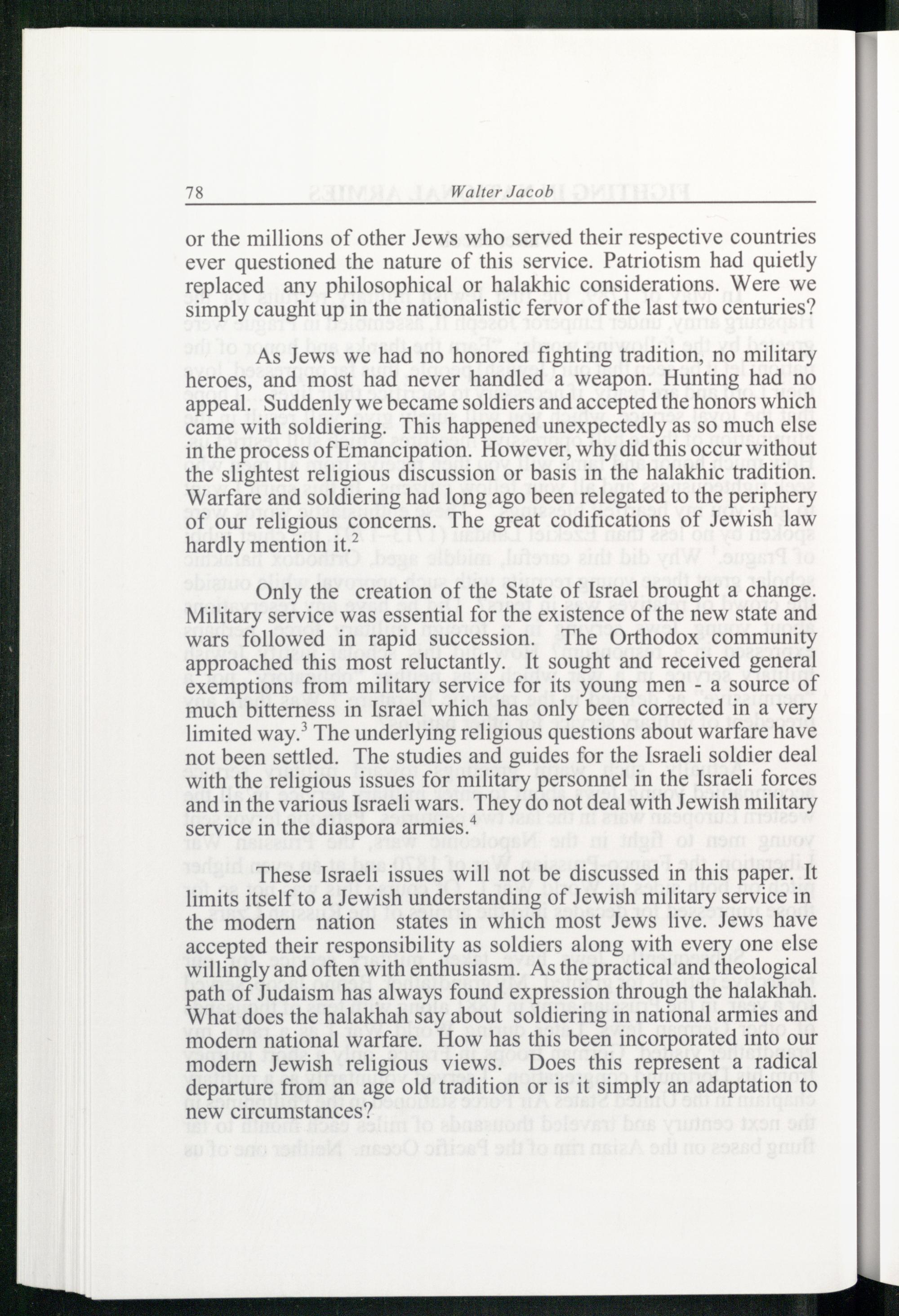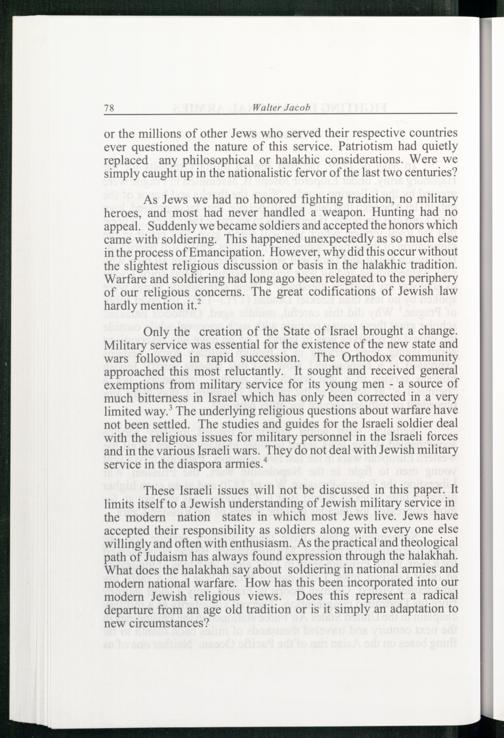 These Israeli issues will not be discussed in this paper. It limits itself to a Jewish understanding of Jewish military service in the modern nation states in which most Jews live. Jews have accepted their responsibility as soldiers along with every one else willingly and often with enthusiasm. As the practical and theological path of Judaism has always found expression through the halakhah. What does the halakhah say about soldiering in national armies and modern national warfare. How has this been incorporated into our modern Jewish religious views. Does this represent a radical departure from an age old tradition or is it simply an adaptation to new circumstances?