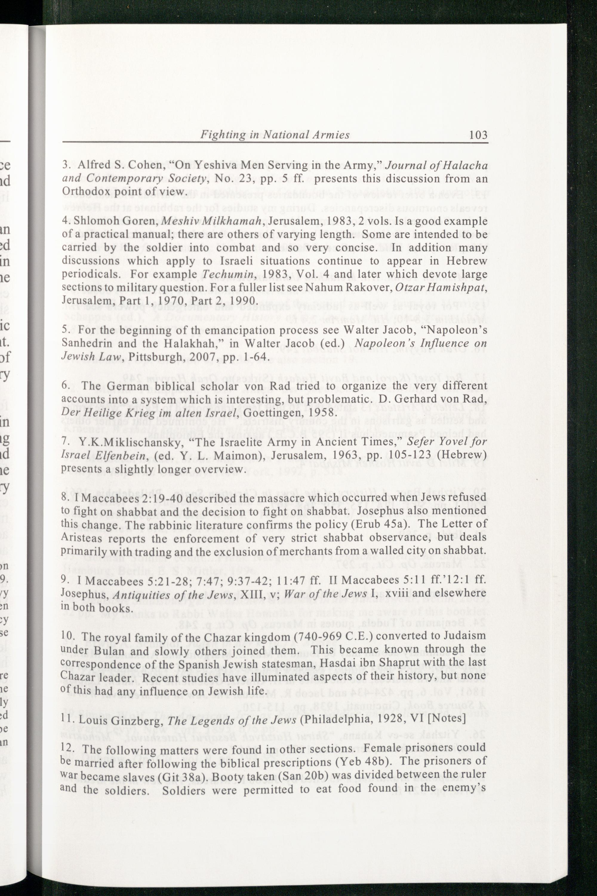 4. Shlomoh Goren, Meshiv Milkhamah, Jerusalem , 1983, 2 vols. Is a good example of a practical manual; there are others of varying length. Some are intended to be carried by the soldier into combat and so very concise. In addition many discussions which apply to Israeli situations continue to appear in Hebrew periodicals. For example Techumin, 1983, Vol. 4 and later which devote large sections to military question. For a fuller list see Nahum Rakover , Otzar Hamishpat, Jerusalem , Part 1, 1970, Part 2, 1990.