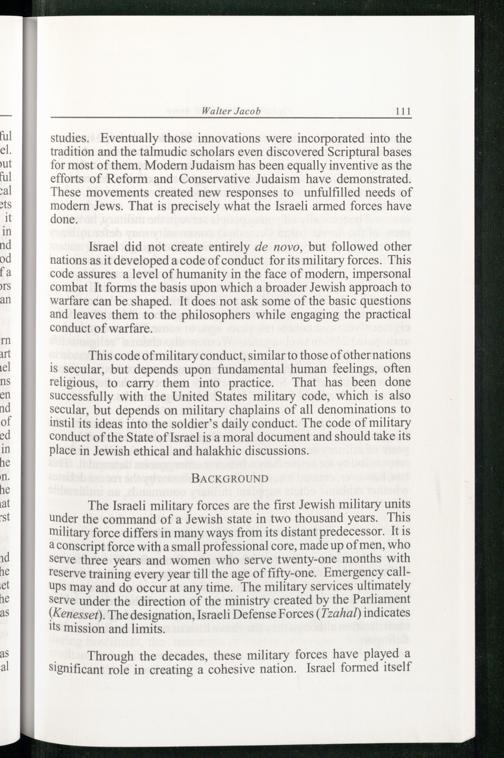 studies. Eventually those innovations were incorporated into the tradition and the talmudic scholars even discovered Scriptural bases for most of them. Modern Judaism has been equally inventive as the efforts of Reform and Conservative Judaism have demonstrated. These movements created new responses to unfulfilled needs of modern Jews . That is precisely what the Israeli armed forces have done.
