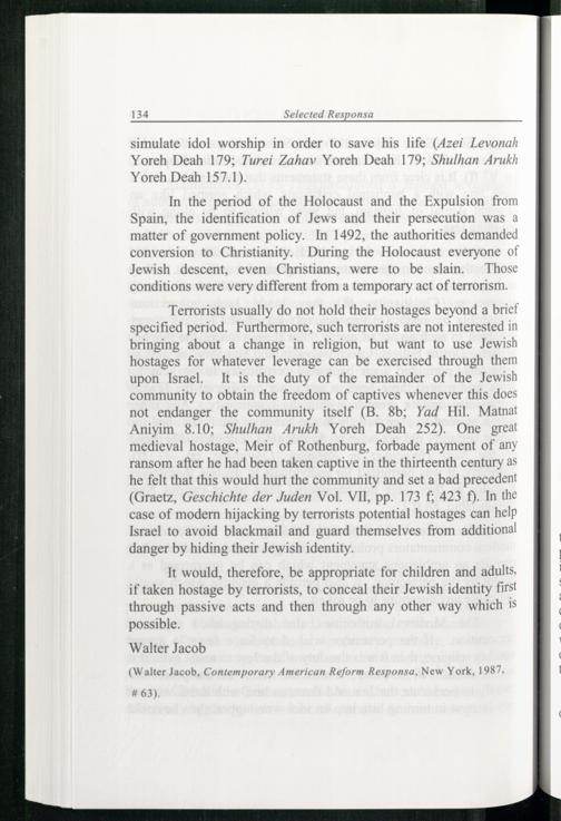 Terrorists usually do not hold their hostages beyond a brief specified period. Furthermore, such terrorists are not interested in bringing about a change in religion, but want to use Jewish hostages for whatever leverage can be exercised through them upon Israel . It is the duty of the remainder of the Jewish community to obtain the freedom of captives whenever this does not endanger the community itself(B. 8b; Yad Hil. Matnat Aniyim 8.10; Shulhan Arukh Yoreh Deah 252). One great medieval hostage, Meir of Rothenburg , forbade payment of any ransom after he had been taken captive in the thirteenth century as he felt that this would hurt the community and set a bad precedent (Graetz, Geschichte der Juden Vol. VII, pp. 173 f; 423 f). In the case of modern hijacking by terrorists potential hostages can help Israel to avoid blackmail and guard themselves from additional danger by hiding their Jewish identity.