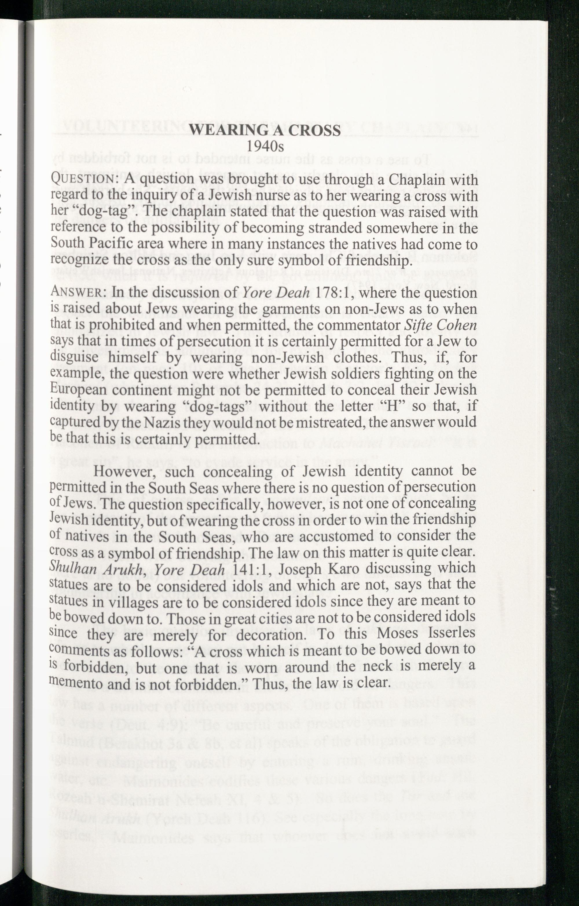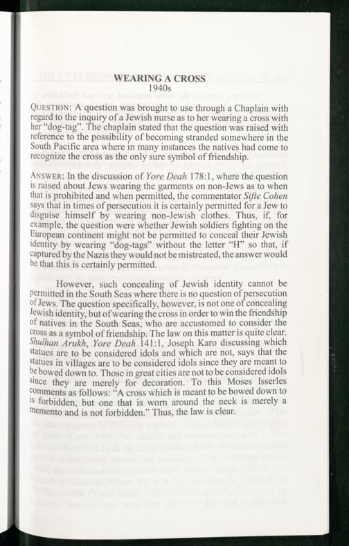 QUESTION: A question was brought to use through a Chaplain with regard to the inquiry of a Jewish nurse as to her wearing a cross with her“dog-tag”. The chaplain stated that the question was raised with reference to the possibility of becoming stranded somewhere in the South Pacific area where in many instances the natives had come to recognize the cross as the only sure symbol of friendship.