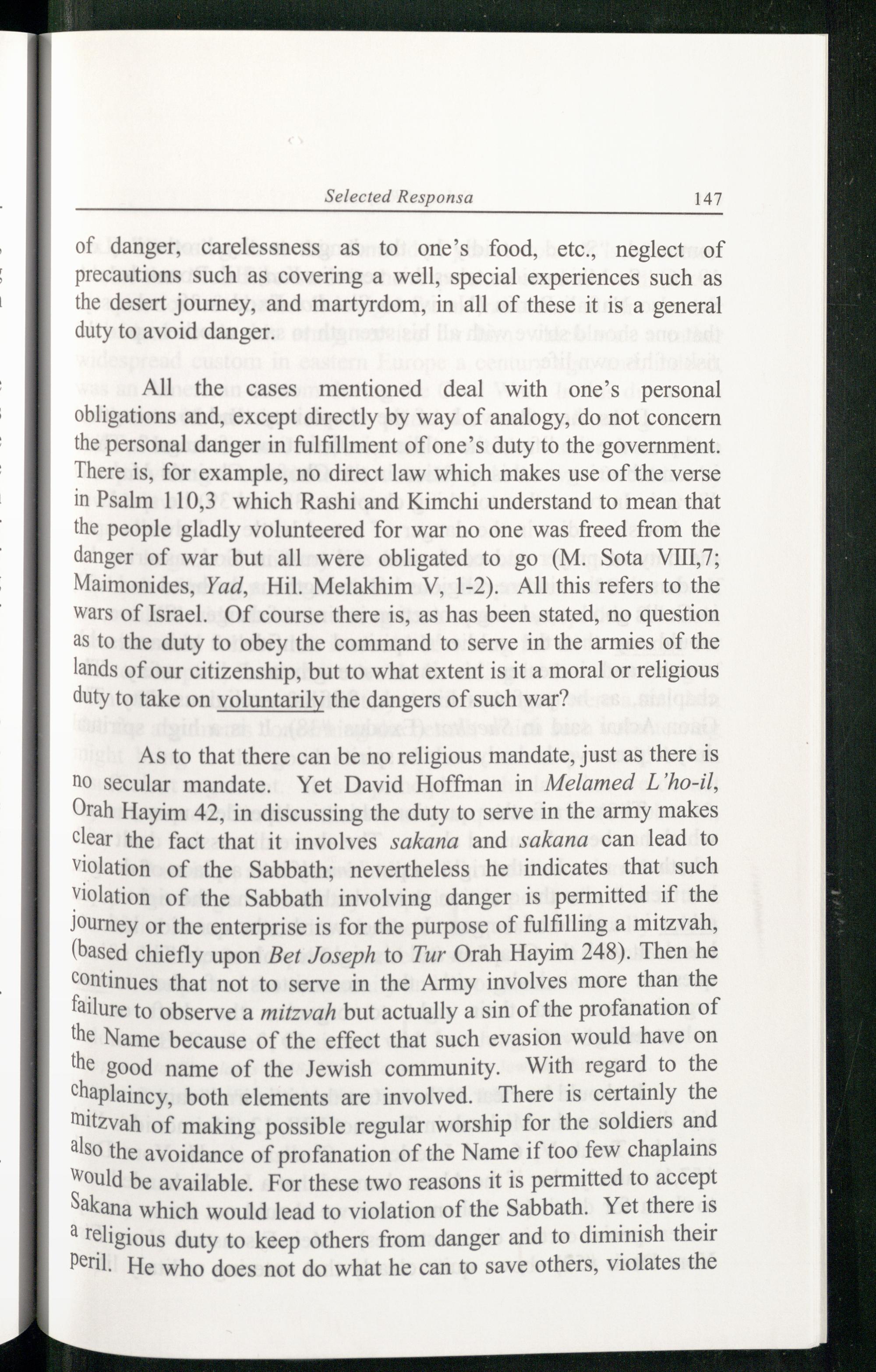 As to that there can be no religious mandate, just as there is 00 secular mandate. Yet David Hoffman in Melamed L’ho-il, Orah Hayim 42, in discussing the duty to serve in the army makes clear the fact that it involves sakana and sakana can lead to violation of the Sabbath ; nevertheless he indicates that such violation of the Sabbath involving danger is permitted if the journey or the enterprise is for the purpose of fulfilling a mitzvah, (based chiefly upon Bet Joseph to Tur Orah Hayim 248). Then he continues that not to serve in the Army involves more than the failure to observe a mitzvah but actually a sin of the profanation of the Name because of the effect that such evasion would have on the good name of the Jewish community. With regard to the chaplaincy, both elements are involved. There is certainly the Mitzvah of making possible regular worship for the soldiers and Also the avoidance of profanation of the Name if too few chaplains Would be available. For these two reasons it is permitted to accept Sakana which would lead to violation of the Sabbath . Yet there is 4 religious duty to keep others from danger and to diminish their Peril. He who does not do what he can to save others, violates the
