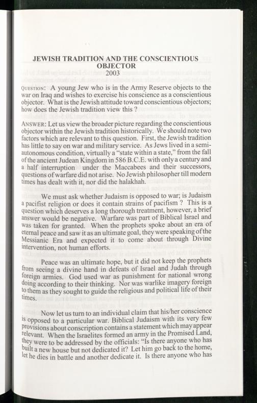 ANSWER: Let us view the broader picture regarding the conscientious objector within the Jewish tradition historically. We should note two factors which are relevant to this question. First, the Jewish tradition has little to say on war and military service. As Jews lived in a semiautonomous condition, virtually a“state within a state,” from the fall of the ancient Judean Kingdom in 586 B.C.E. with only a century and a half interruption under the Maccabees and their successors, questions of warfare did not arise. No Jewish philosopher till modern times has dealt with it, nor did the halakhah.