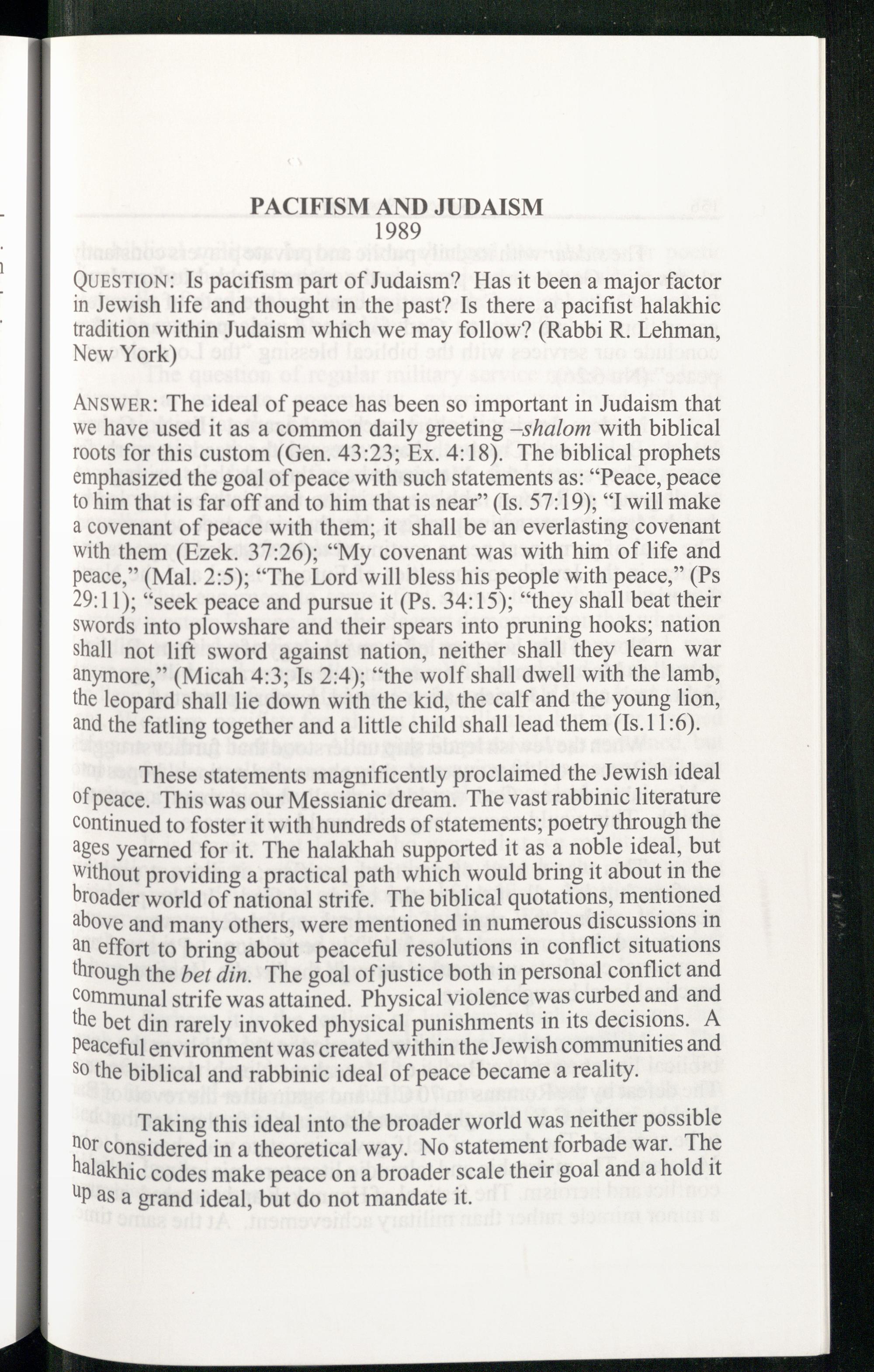 QUESTION: Is pacifism part of Judaism ? Has it been a major factor in Jewish life and thought in the past? Is there a pacifist halakhic tradition within Judaism which we may follow?(Rabbi R. Lehman, New York )