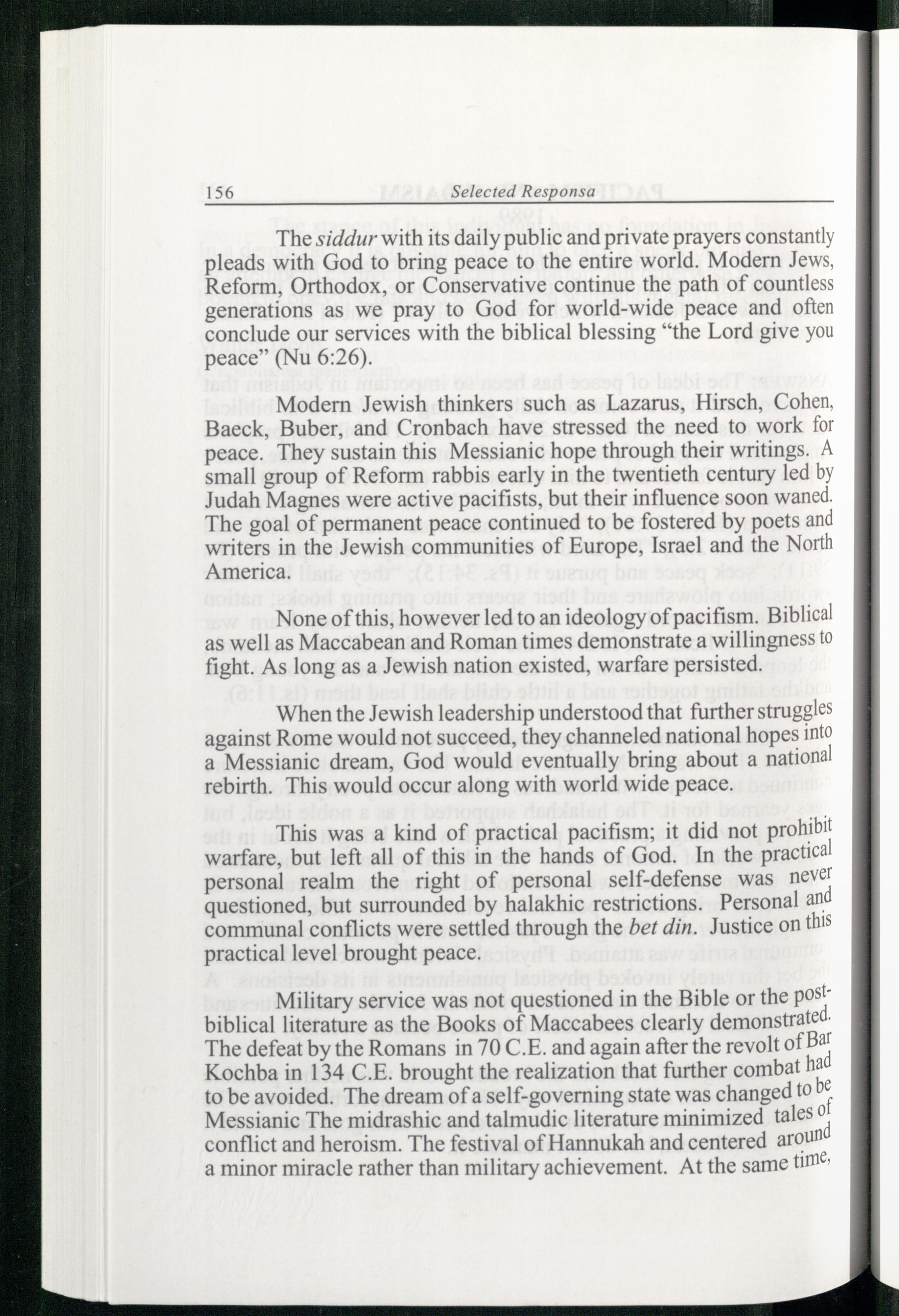 Military service was not questioned in the Bible or the postbiblical literature as the Books of Maccabees clearly demonstrate The defeat by the Romans in 70 C.E. and again after the revolt of Bat Kochba in 134 C.E. brought the realization that further combat ha to be avoided. The dream of a self-governing state was changed 10 be Messianic The midrashic and talmudic literature minimized tales© conflict and heroism. The festival of Hannukah and centered aro” a minor miracle rather than military achievement. At the same time;