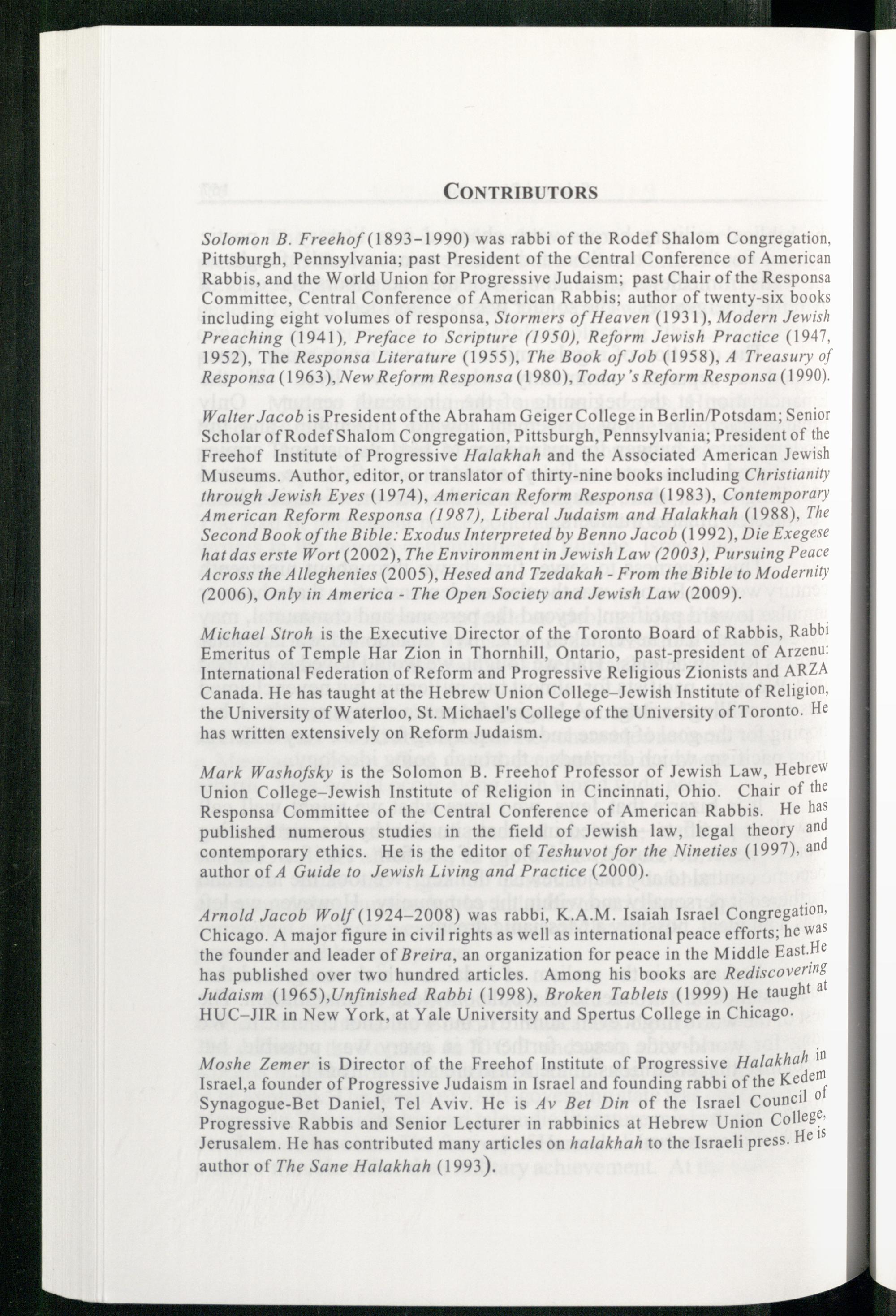 Mark Washofsky is the Solomon B. Freehof Professor of Jewish Law, Hebrew Union College-Jewish Institute of Religion in Cincinnati , Ohio . Chair of the Responsa Committee of the Central Conference of American Rabbis. He has published numerous studies in the field of Jewish law, legal theory and contemporary ethics. He is the editor of Teshuvot for the Nineties(1997), an author of 4 Guide to Jewish Living and Practice(2000).