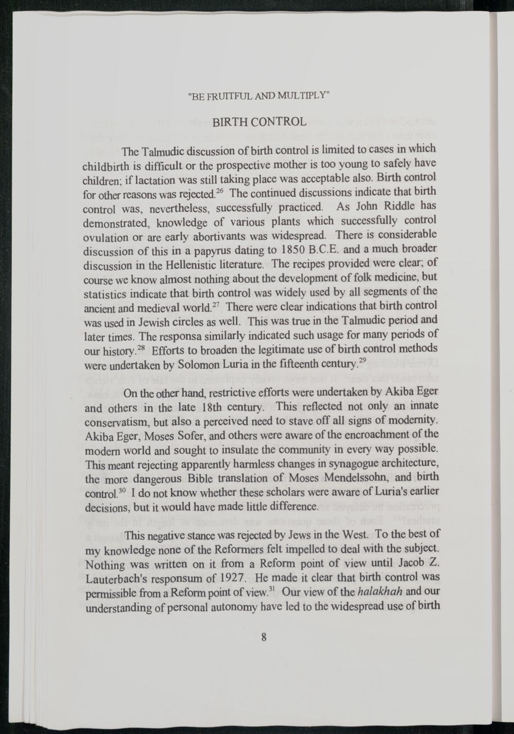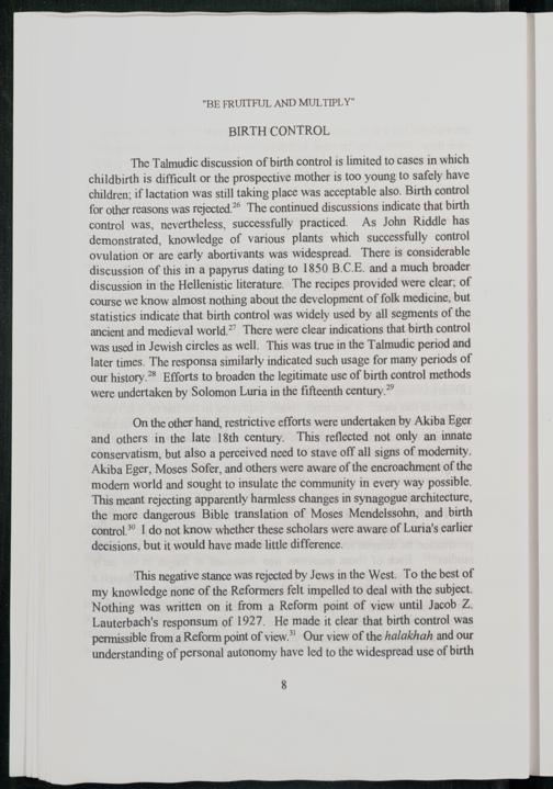 This negative stance was rejected by Jews in the West. To the best of my knowledge none of the Reformers felt impelled to deal with the subject. Nothing was written on it from a Reform point of view until Jacob Z. Lauterbach's responsum of 1927. He made it clear that birth control was permissible from a Reform point of view.” Our view of the halakhah and our understanding of personal autonomy have led to the widespread use of birth
