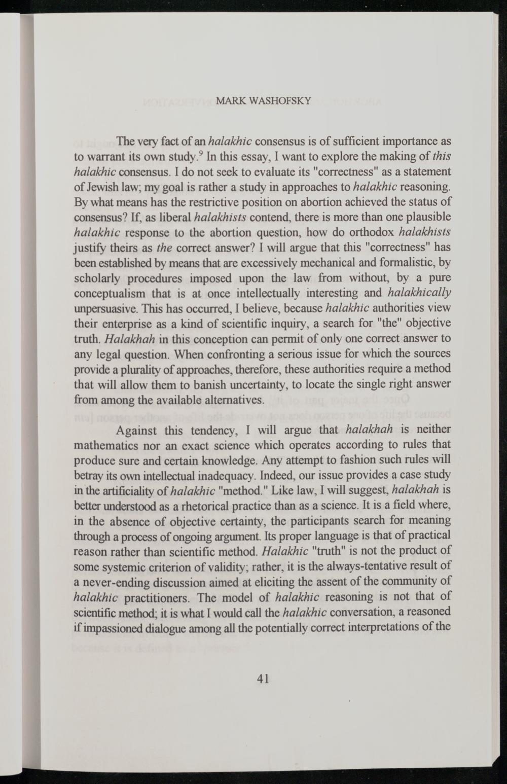 The very fact of an halakhic consensus is of sufficient importance as to warrant its own study.’ In this essay, I want to explore the making of this halakhic consensus. I do not seek to evaluate its"correctness" as a statement of Jewish law; my goal is rather a study in approaches to halakhic reasoning. By what means has the restrictive position on abortion achieved the status of consensus? If, as liberal halakhists contend, there is more than one plausible halakhic response to the abortion question, how do orthodox halakhists justify theirs as the correct answer? I will argue that this"correctness" has been established by means that are excessively mechanical and formalistic, by scholarly procedures imposed upon the law from without, by a pure conceptualism that is at once intellectually interesting and halakhically unpersuasive. This has occurred, I believe, because halakhic authorities view their enterprise as a kind of scientific inquiry, a search for"the" objective truth. Halakhah in this conception can permit of only one correct answer to any legal question. When confronting a serious issue for which the sources provide a plurality of approaches, therefore, these authorities require a method that will allow them to banish uncertainty, to locate the single right answer from among the available alternatives.