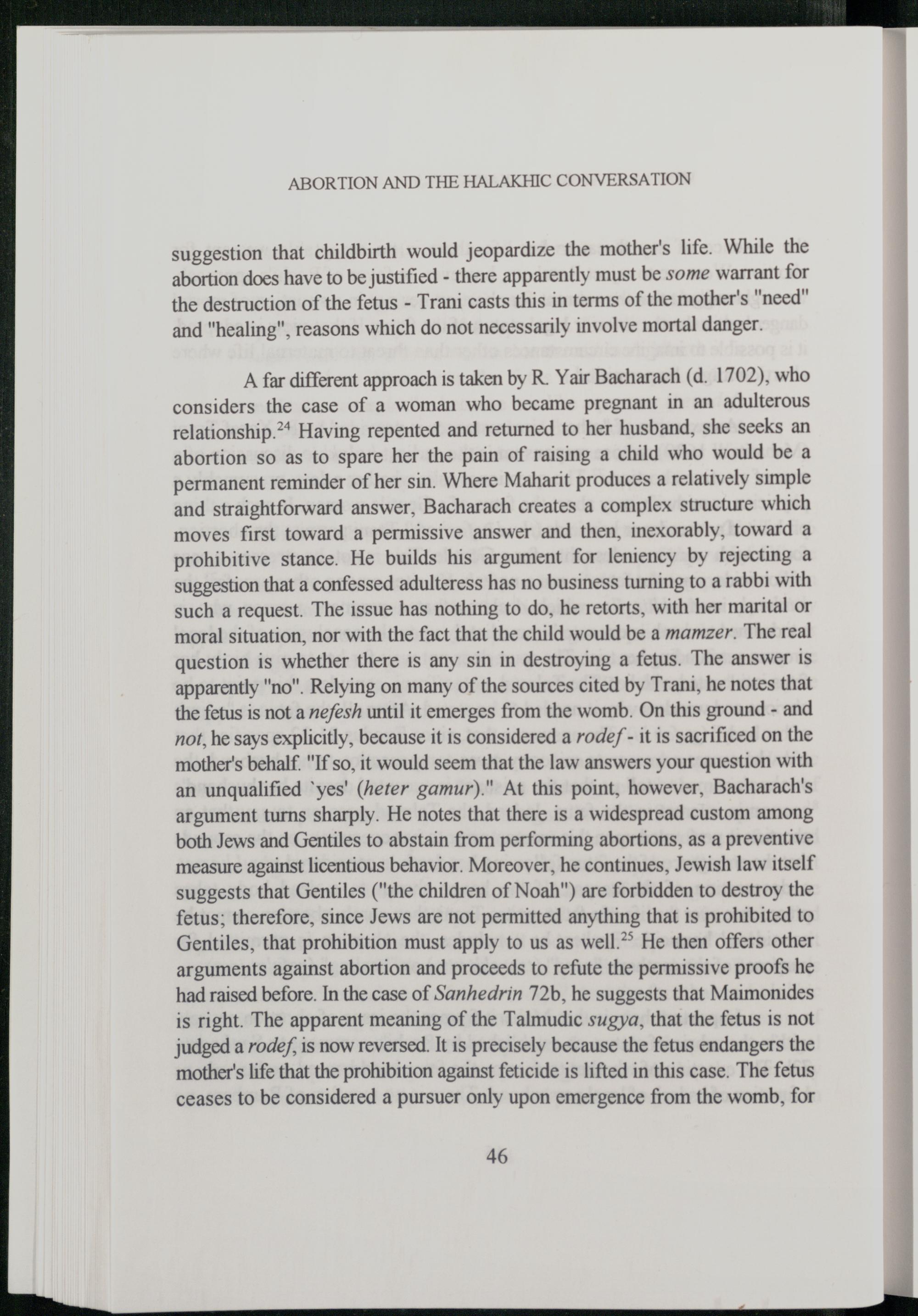 A far different approach is taken by R. Yair Bacharach(d. 1702), who considers the case of a woman who became pregnant in an adulterous relationship.>* Having repented and returned to her husband, she seeks an abortion so as to spare her the pain of raising a child who would be a permanent reminder of her sin. Where Maharit produces a relatively simple and straightforward answer, Bacharach creates a complex structure which moves first toward a permissive answer and then, inexorably, toward a prohibitive stance. He builds his argument for leniency by rejecting a suggestion that a confessed adulteress has no business turning to a rabbi with such a request. The issue has nothing to do, he retorts, with her marital or moral situation, nor with the fact that the child would be a mamzer. The real question is whether there is any sin in destroying a fetus. The answer is apparently"no". Relying on many of the sources cited by Trani, he notes that the fetus is not a nefesh until it emerges from the womb. On this ground- and not, he says explicitly, because it is considered a rodef- it is sacrificed on the mother's behalf."If so, it would seem that the law answers your question with an unqualified'yes'(heter gamur)." At this point, however, Bacharach's argument turns sharply. He notes that there is a widespread custom among both Jews and Gentiles to abstain from performing abortions, as a preventive measure against licentious behavior. Moreover, he continues, Jewish law itself suggests that Gentiles("the children of Noah") are forbidden to destroy the fetus; therefore, since Jews are not permitted anything that is prohibited to Gentiles, that prohibition must apply to us as well.” He then offers other arguments against abortion and proceeds to refute the permissive proofs he had raised before. In the case of Sanhedrin 72b, he suggests that Maimonides is right. The apparent meaning of the Talmudic sugya, that the fetus is not judged a rodef, is now reversed. It is precisely because the fetus endangers the mother's life that the prohibition against feticide is lifted in this case. The fetus ceases to be considered a pursuer only upon emergence from the womb, for